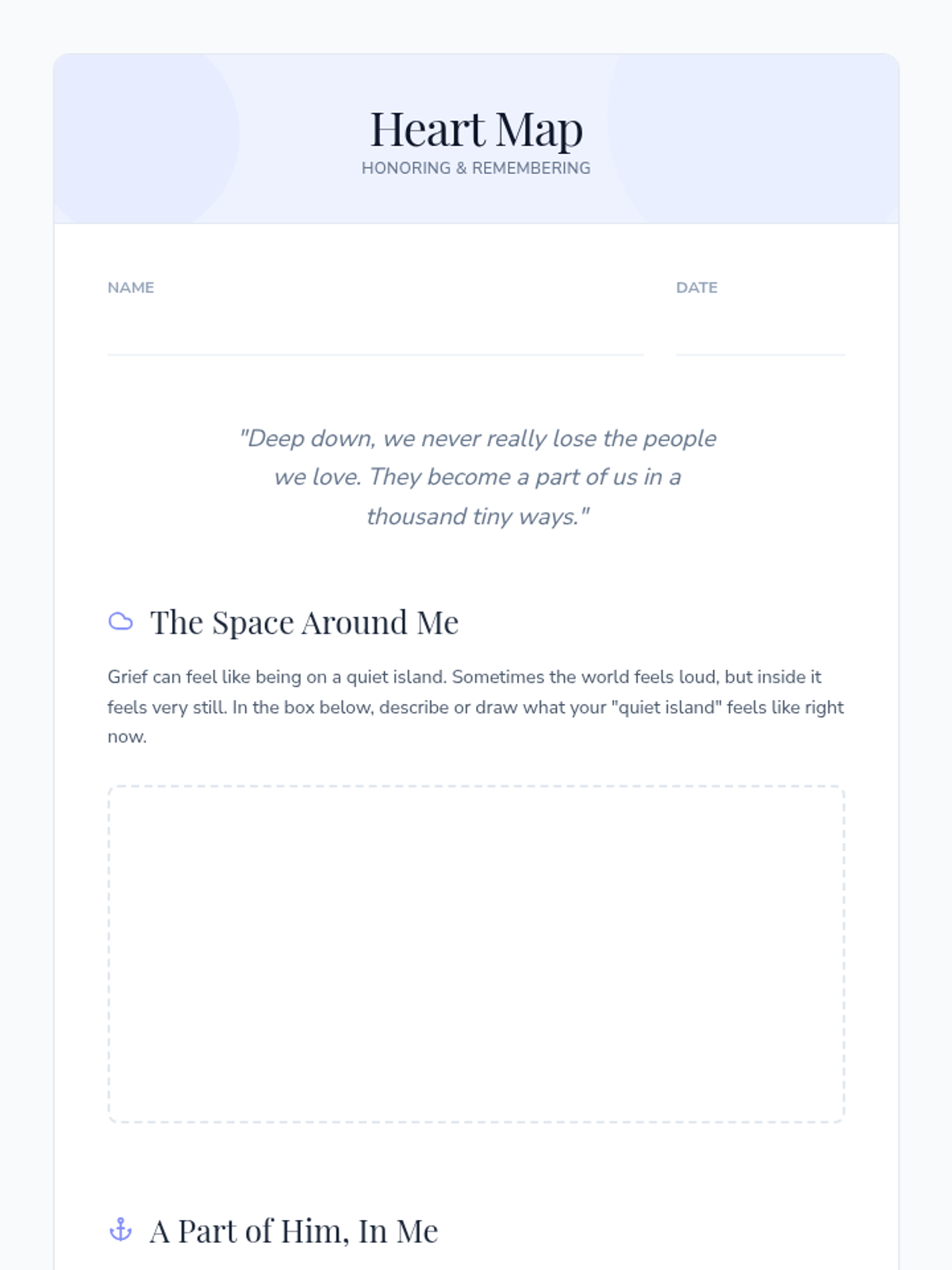 A student-facing reflection worksheet designed to help a teenager process feelings of isolation and identify the continuing connection they have with their deceased father.