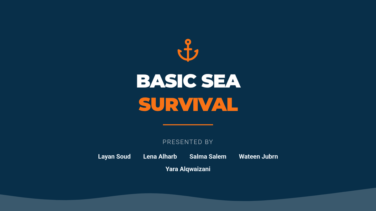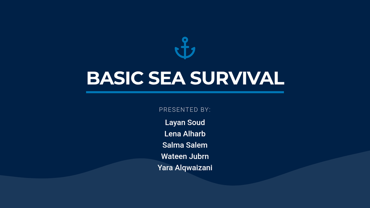A comprehensive slide presentation covering the essentials of sea survival, including real-life examples, risks, equipment, and survival tips. Designed with a high-contrast maritime safety theme.