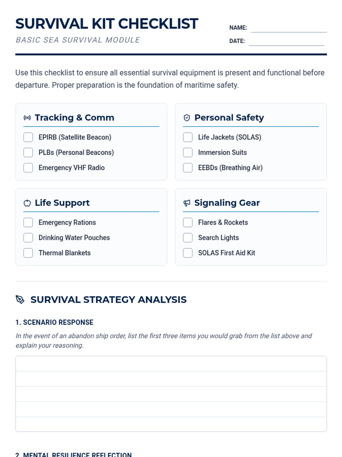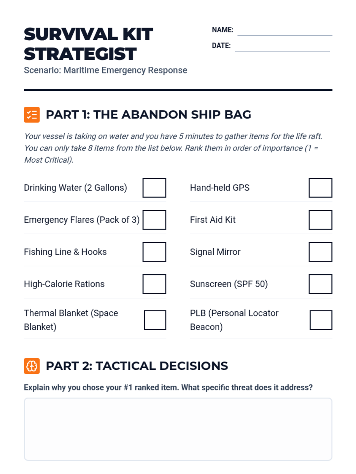 A student-facing checklist and reflection worksheet for evaluating maritime survival equipment and strategic responses to emergencies. Features ruled writing areas and optimized layout for single-page printing.