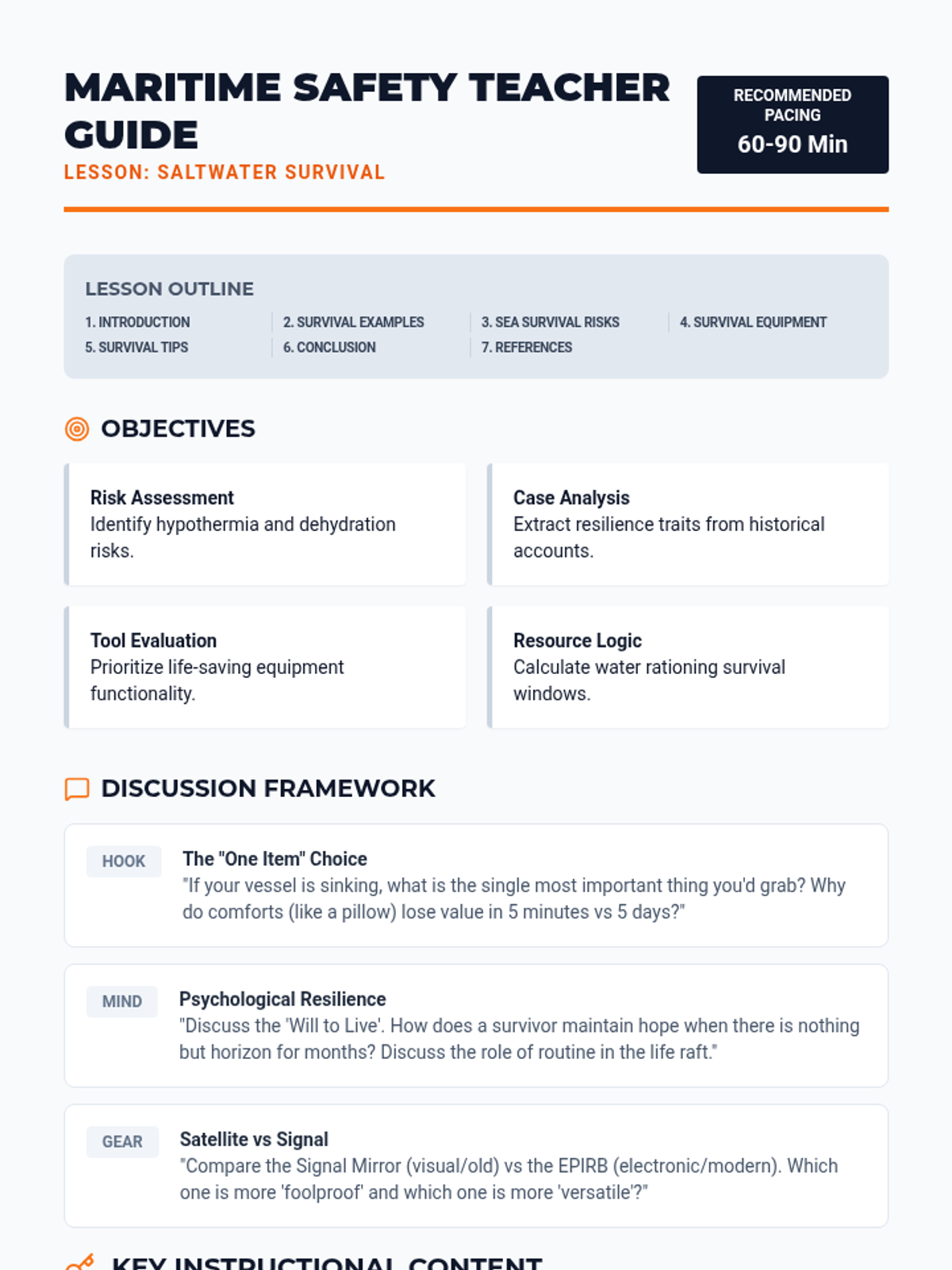 A teacher-facing guide providing lesson objectives, discussion prompts, key instructional points on maritime survival, and an answer key for the student worksheet.