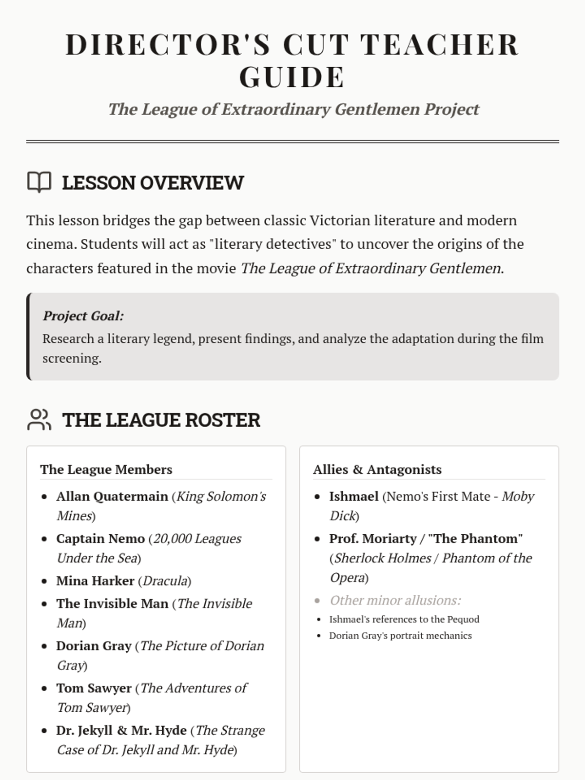 A teacher's facilitation guide for the 'Literary Legends Crossover' project, including a character roster, pacing guide, and discussion prompts.