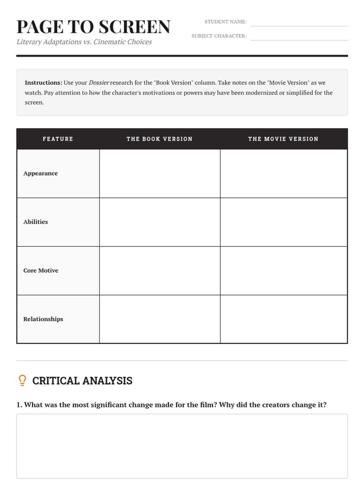 A comparison chart for students to record differences between the original literary version of a character and its cinematic counterpart in the film.