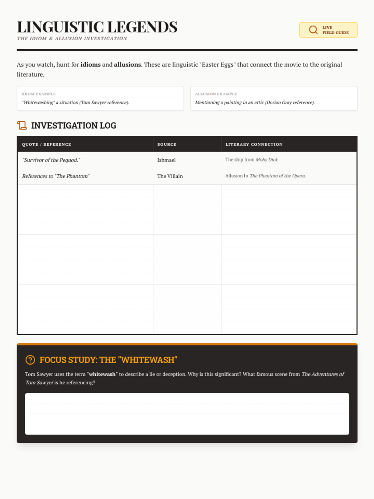 A watching guide focused on identifying literary idioms and allusions used by the characters throughout the film.