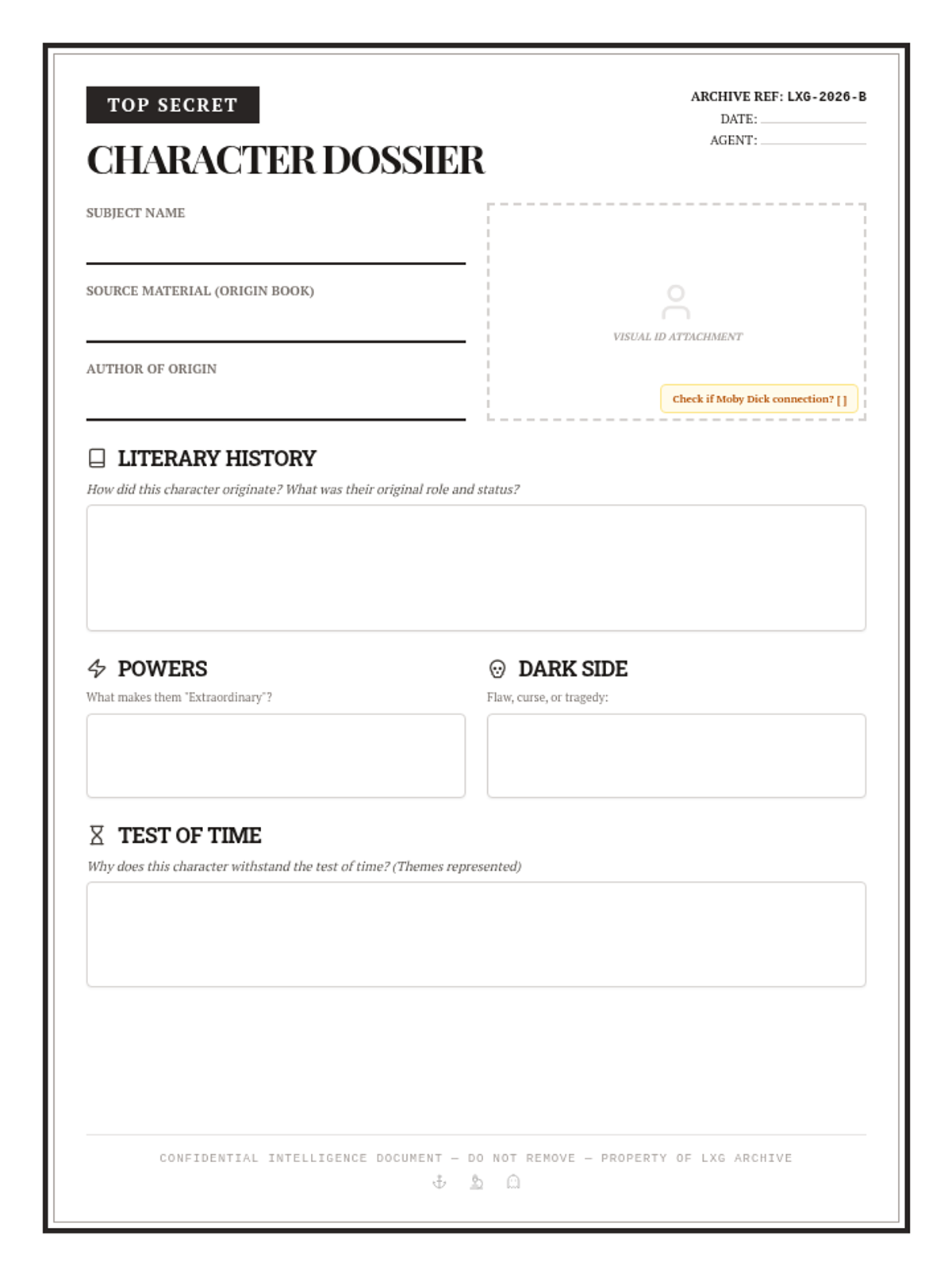 A structured 'Secret Dossier' research worksheet for students to document the literary origins, traits, and endurance of their assigned character.