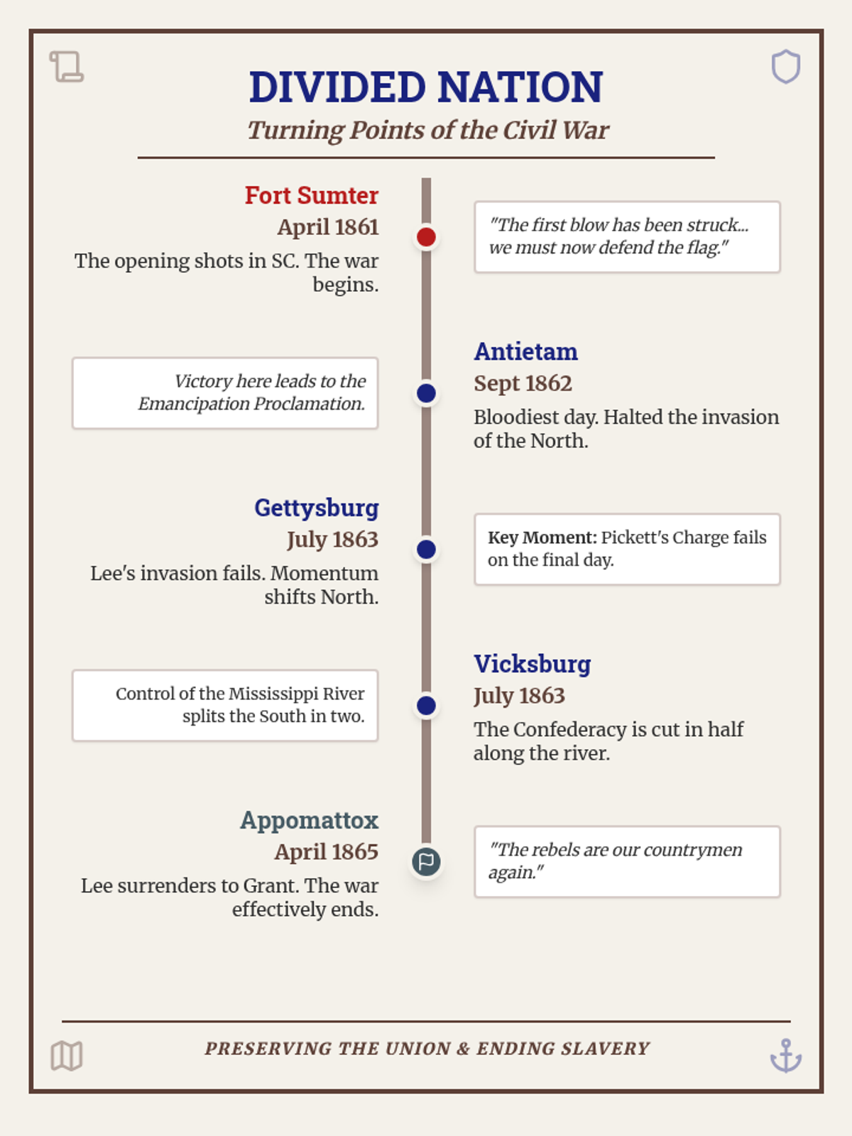 A high-visibility classroom anchor chart highlighting five major turning points of the American Civil War. Designed with large, readable text and historical motifs for middle school classroom display.