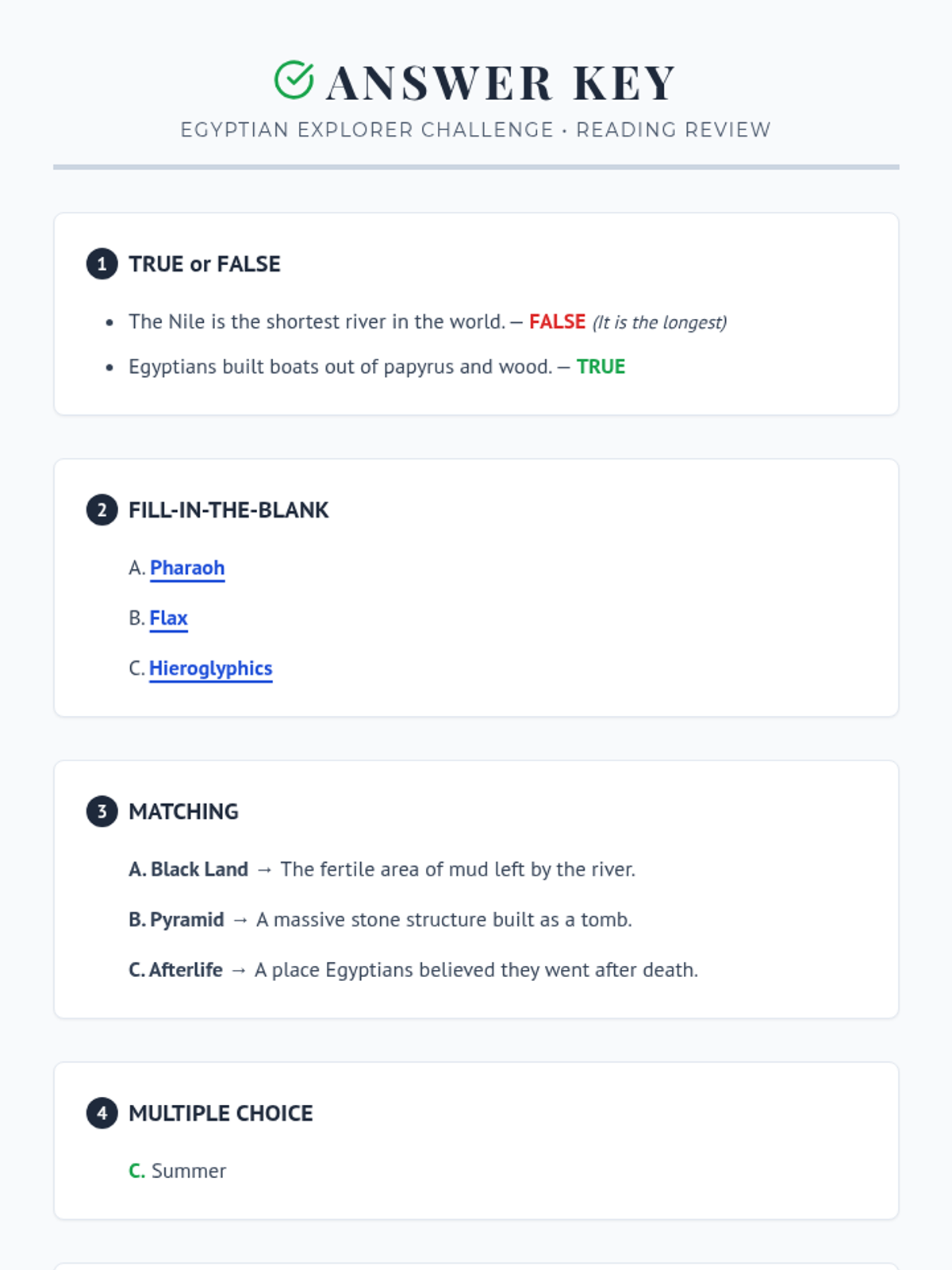 Answer key for the Desert Kings Challenge Sheet, providing correct answers for all 10 challenges including true/false, multiple choice, sequencing, and sample short responses.