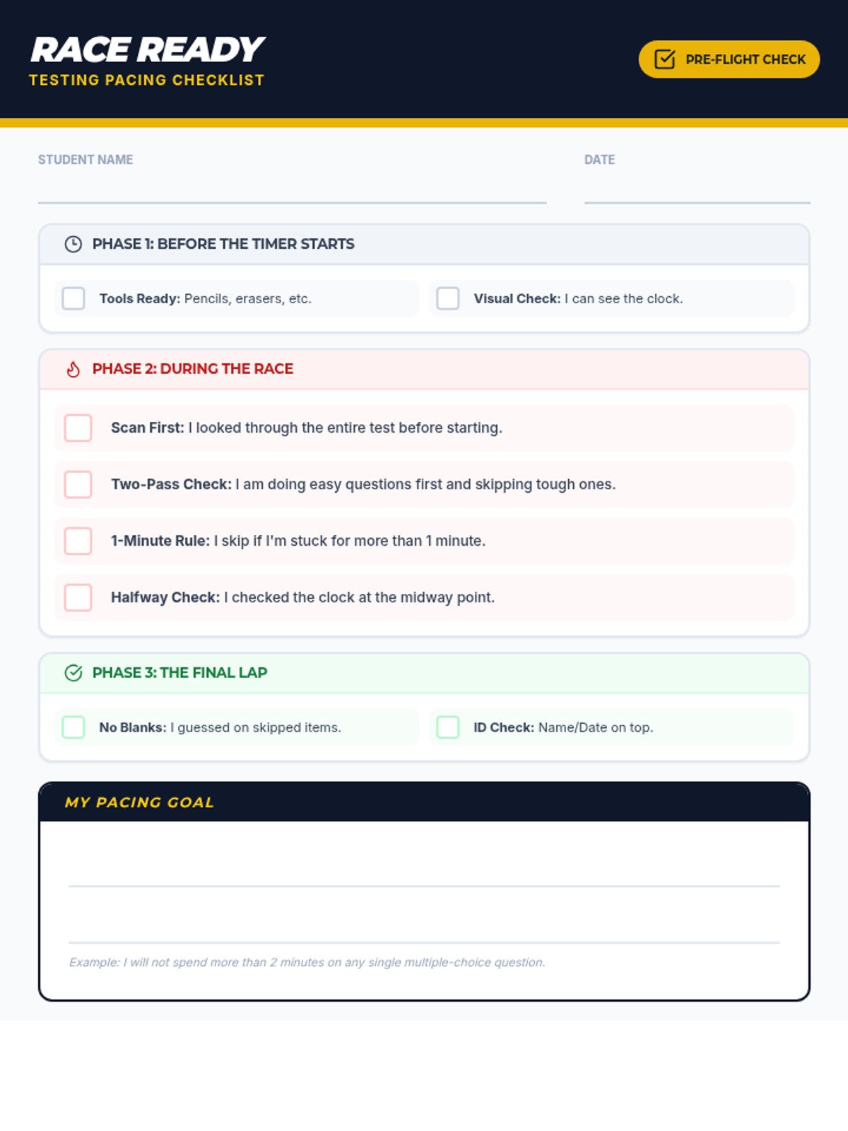 A student-facing checklist for managing time before, during, and after a test, formatted with a racing theme to encourage momentum.