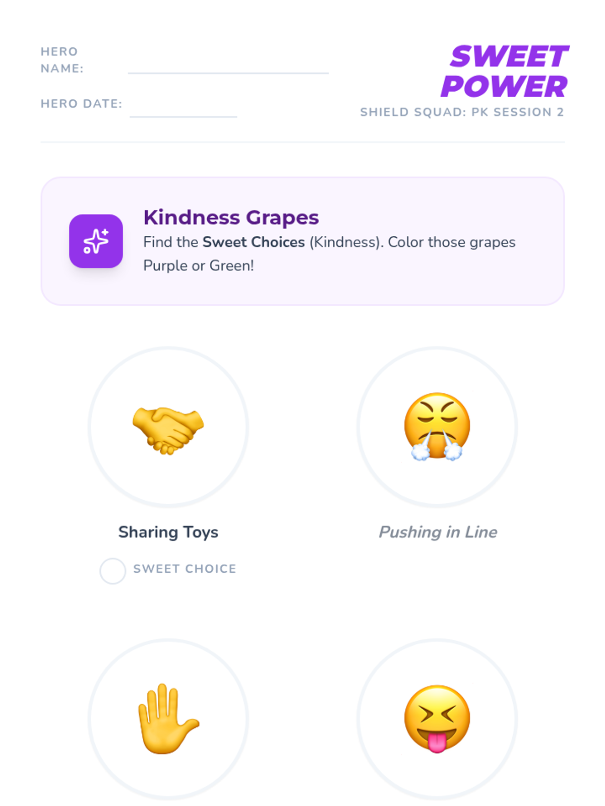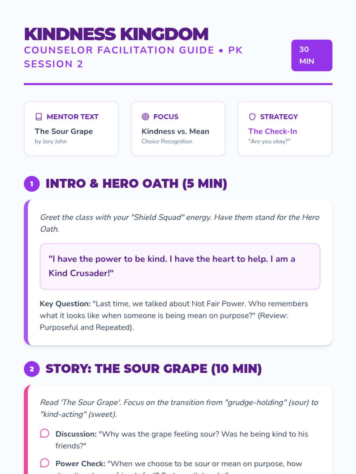 Counselor guide for PK using 'The Sour Grape' by Jory John. Includes lesson script, Hero Oath, and instructions for the Kindness Grapes sorting/coloring activity.