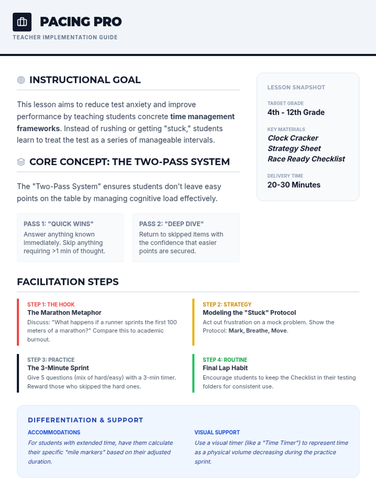 A professional guide for teachers to implement pacing strategies, featuring the 'Two-Pass' system explanation and a 4-step facilitation plan.