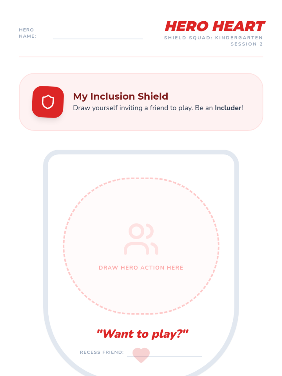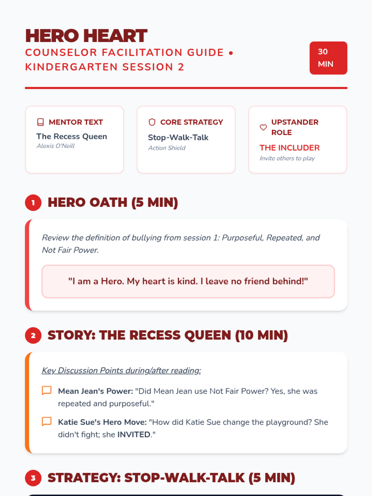 Counselor guide for Kindergarten using 'The Recess Queen' by Alexis O'Neill. Includes lesson script, Stop-Walk-Talk strategy review, and instructions for the Hero Heart Shield activity.