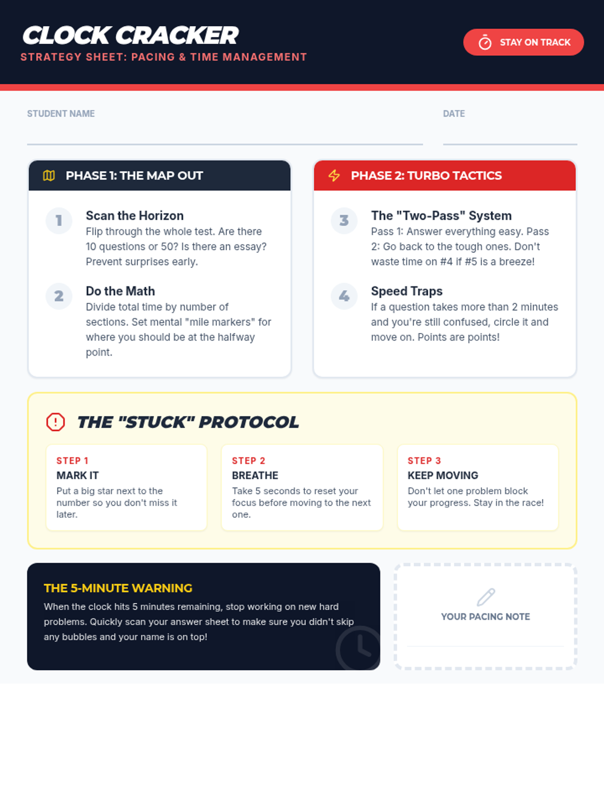 A high-energy student strategy sheet focused on time management and pacing during exams, featuring the 'Two-Pass' system and 'The Stuck Protocol'.