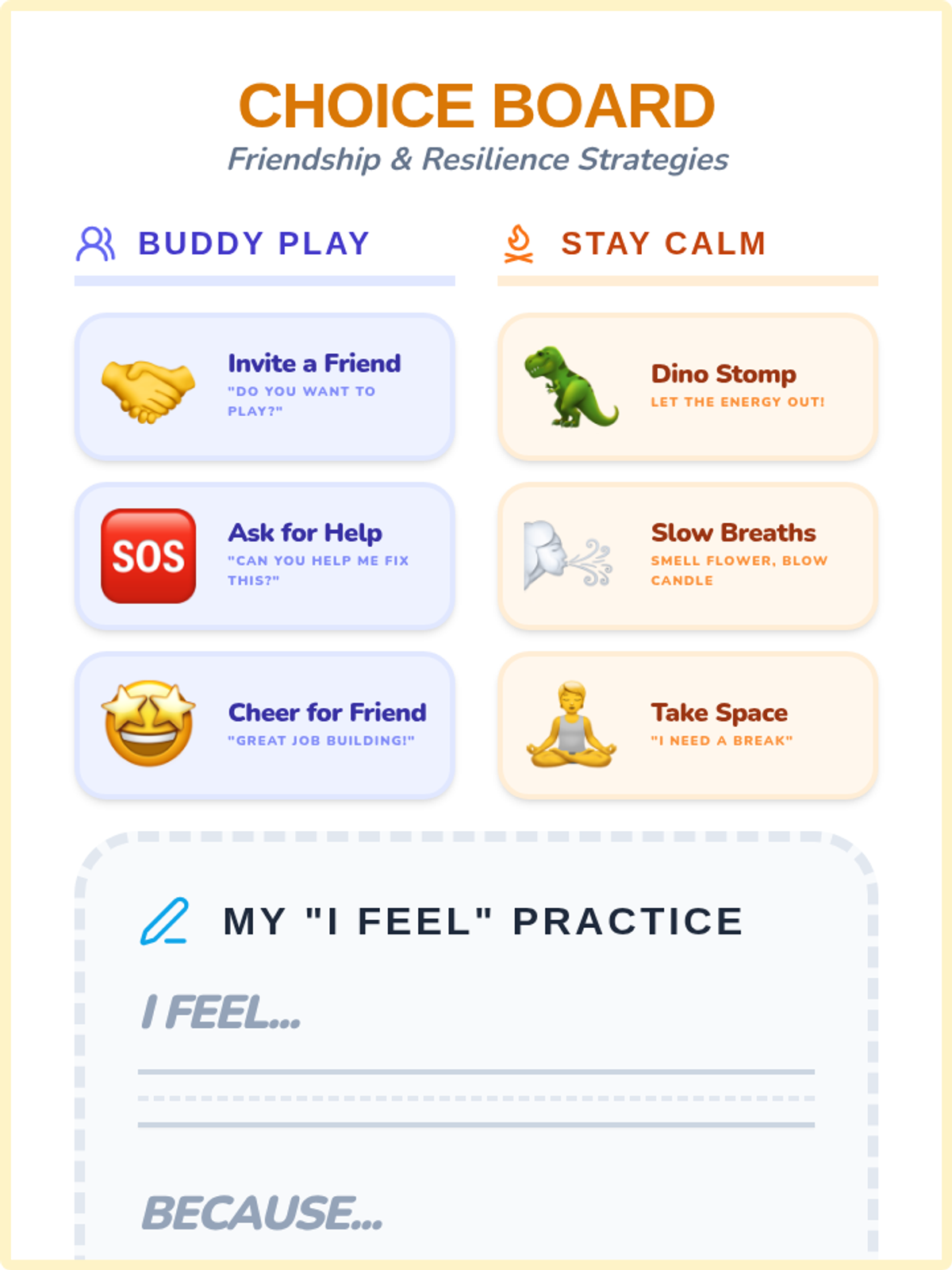 A choice board for students to visually select friendship and emotional regulation strategies. Includes a guided section for practicing "I feel" statements with clear handwriting areas.