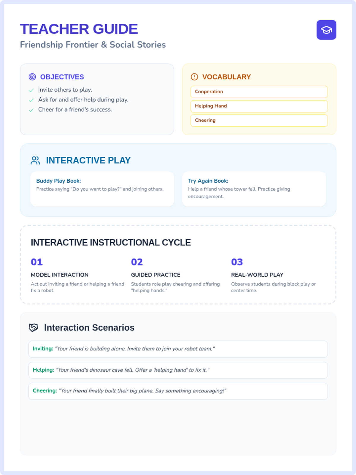 A comprehensive teacher guide for the Buddy Play Book, including learning objectives, discussion prompts, vocabulary, and role-play scenarios to reinforce friendship skills.