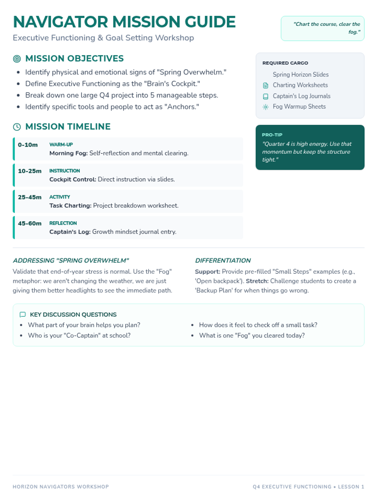 A comprehensive lesson plan for teachers, outlining the objectives, timeline, and facilitation strategies for the Horizon Navigators workshop.