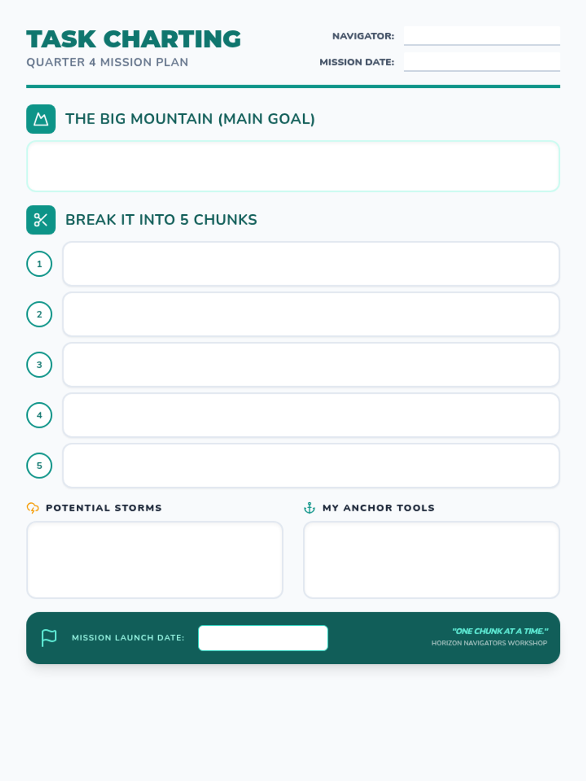 A practical student worksheet that guides them through the 'chunking' process, breaking a large project into five manageable steps and identifying obstacles.