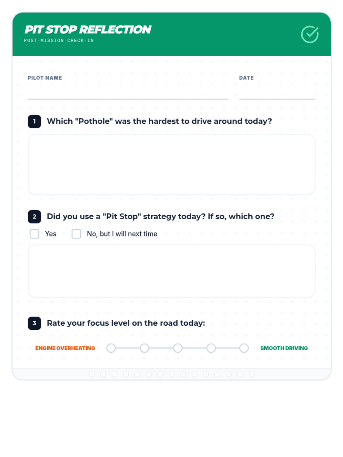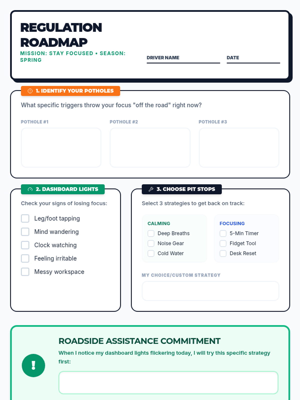 An interactive student worksheet designed as a 'Roadmap' for identifying personal sensory triggers (Potholes), physical warning signs (Dashboard Lights), and specific regulation strategies (Pit Stops). Includes ample space for personalized planning.