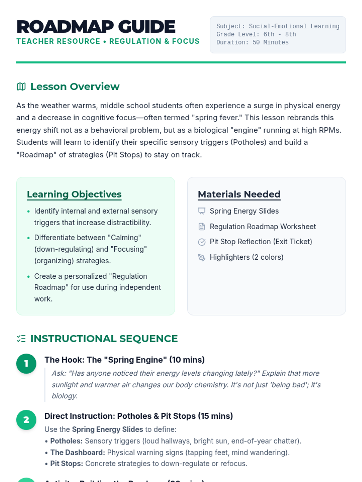 A comprehensive teacher guide for the Spring Energy Roadmap lesson, including learning objectives, materials, instructional sequence, and professional tips for managing middle school classroom energy.