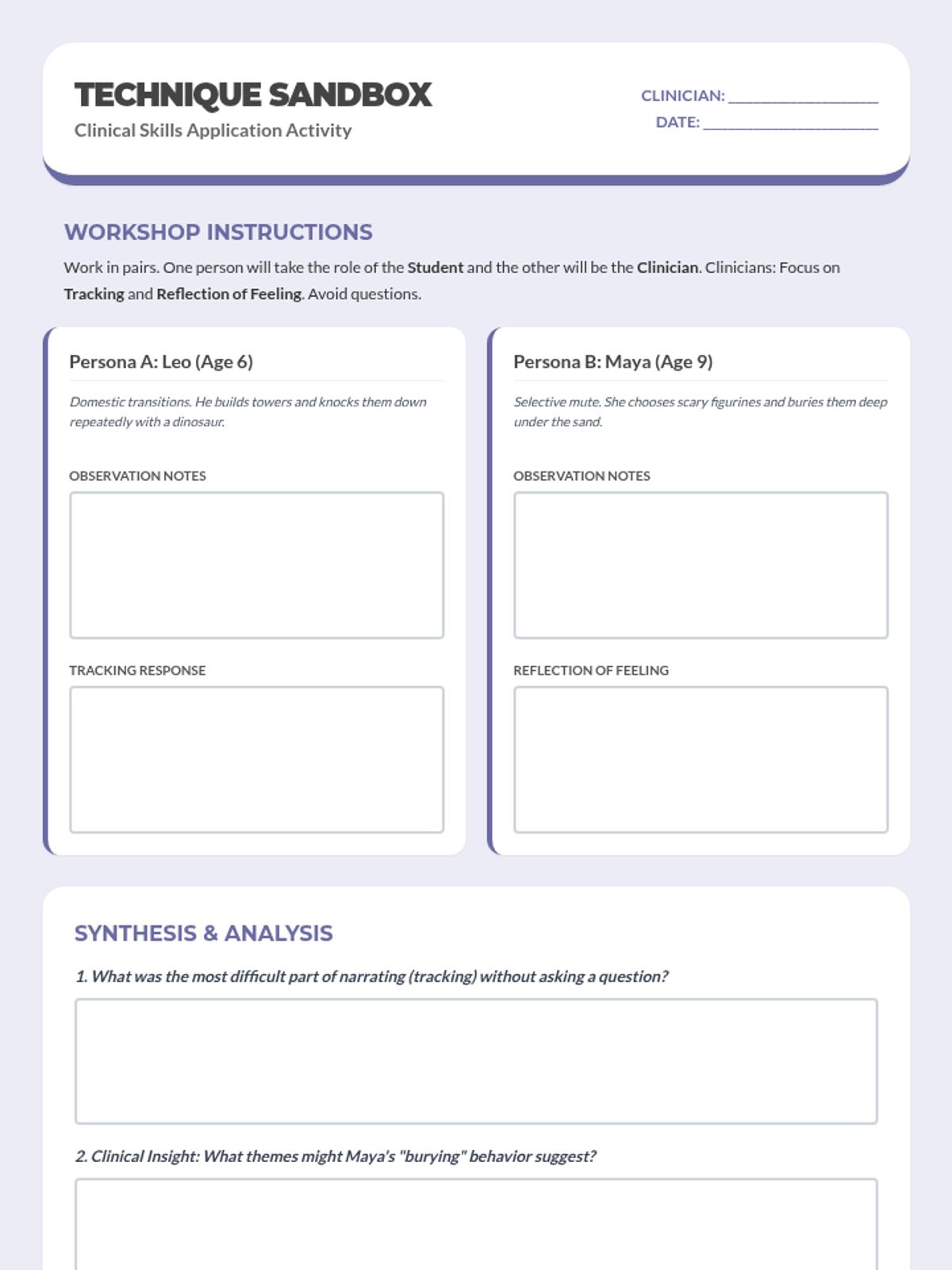 A hands-on worksheet for clinical staff to practice play therapy techniques using specific student case studies and personas.