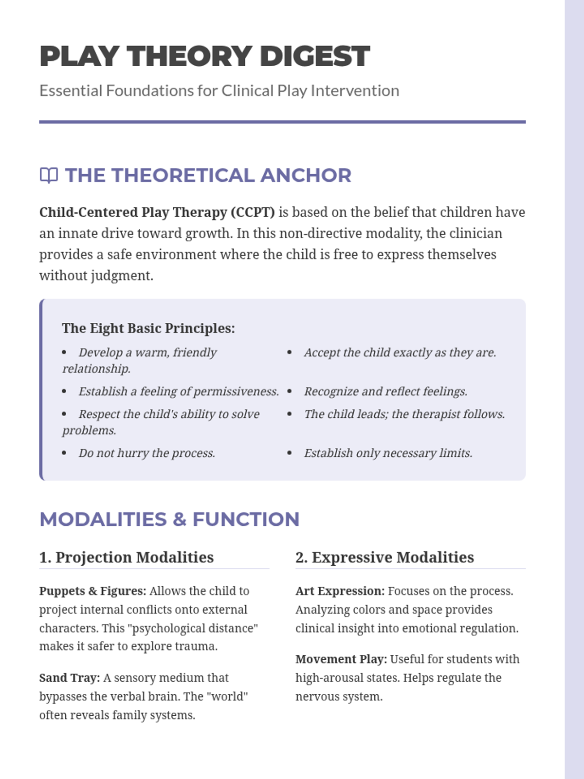 A professional reading summary for clinical staff, detailing the theoretical foundations of Child-Centered Play Therapy and core therapeutic techniques.