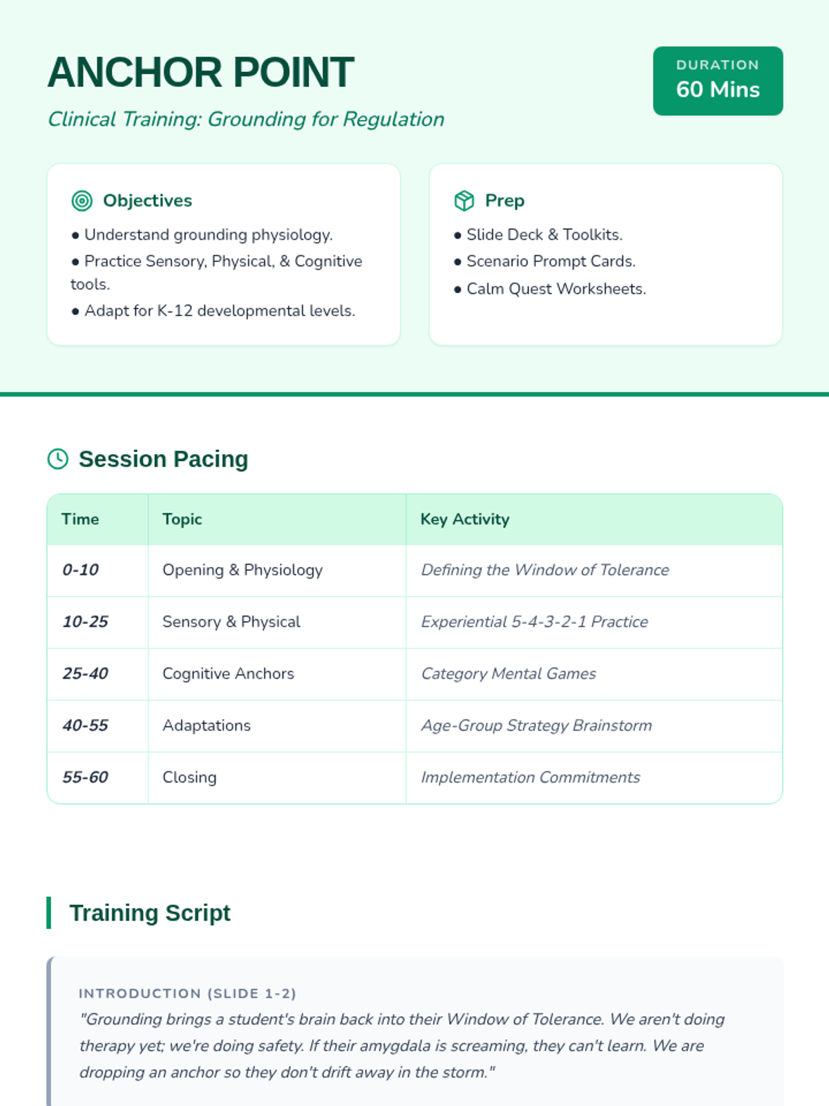A comprehensive facilitator guide for clinical staff, including a training script, session pacing, and scenario-based practice prompts for teaching grounding techniques.