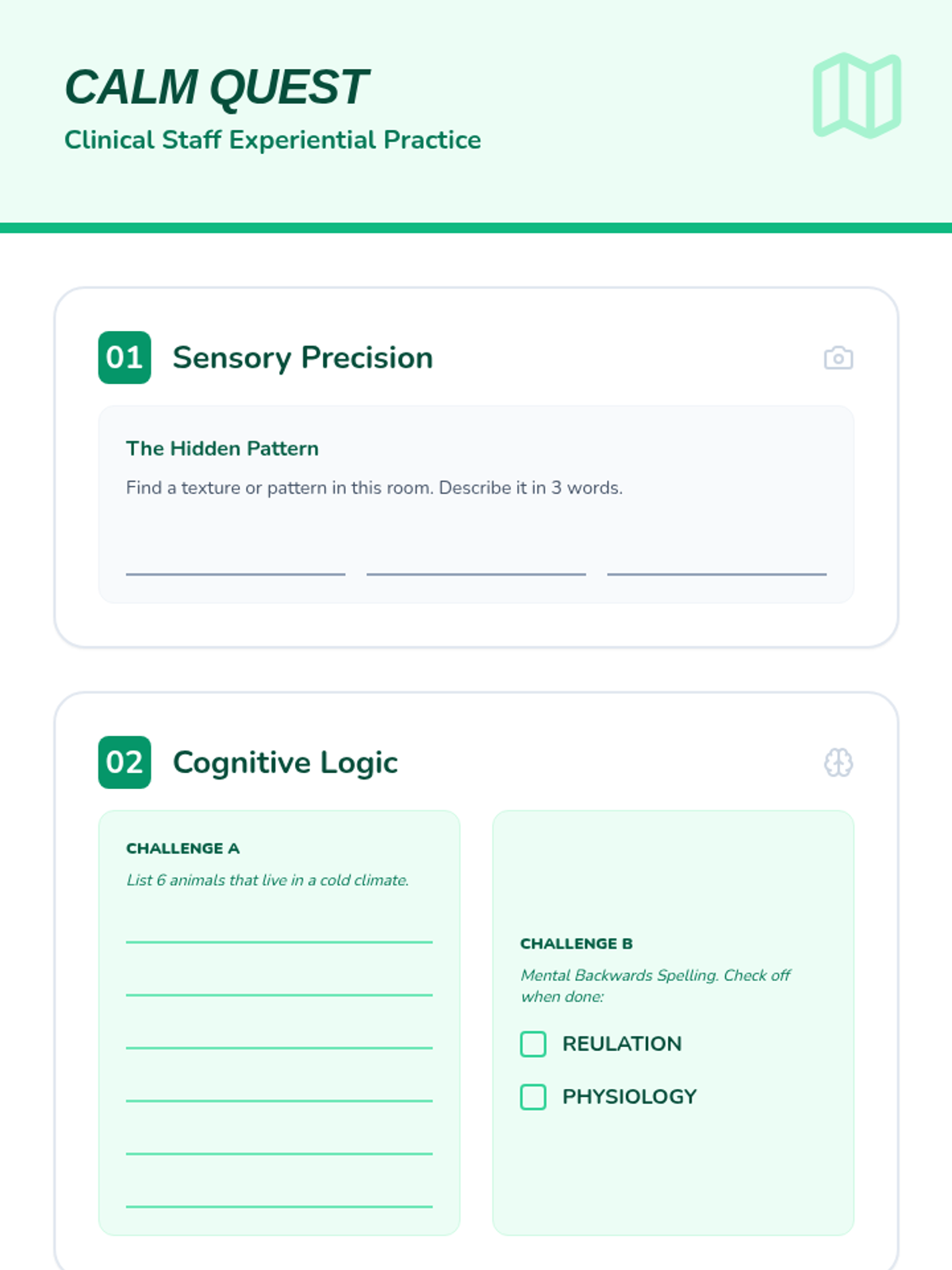 An experiential "scavenger hunt" for clinical staff to practice grounding techniques themselves. Includes sensory precision tasks, cognitive override challenges, and a section for developmental adaptation.