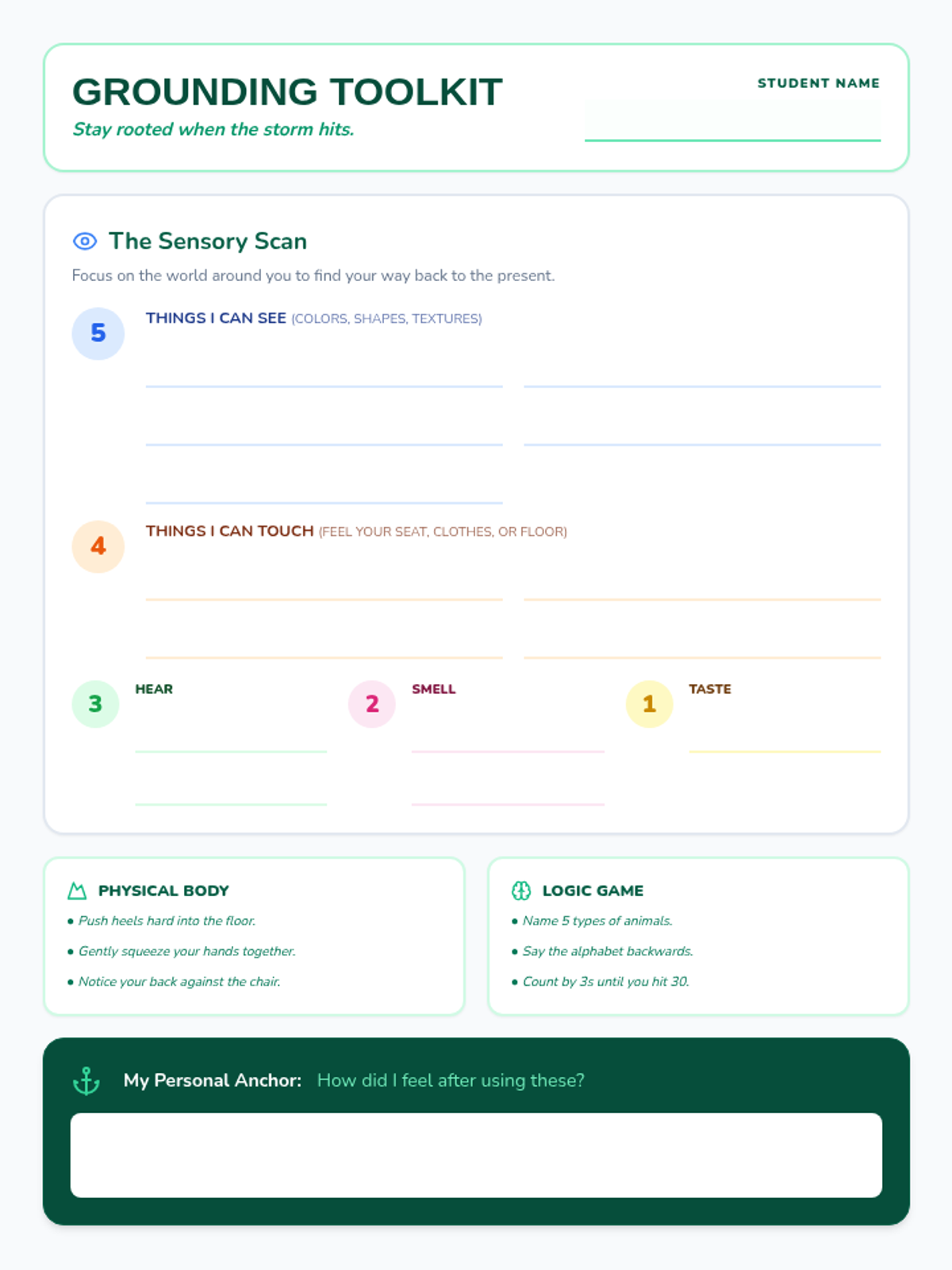 A student-facing toolkit with fillable sections for the 5-4-3-2-1 technique, physical anchors like "Tree Roots," and cognitive "Mind Games" to use during moments of anxiety.