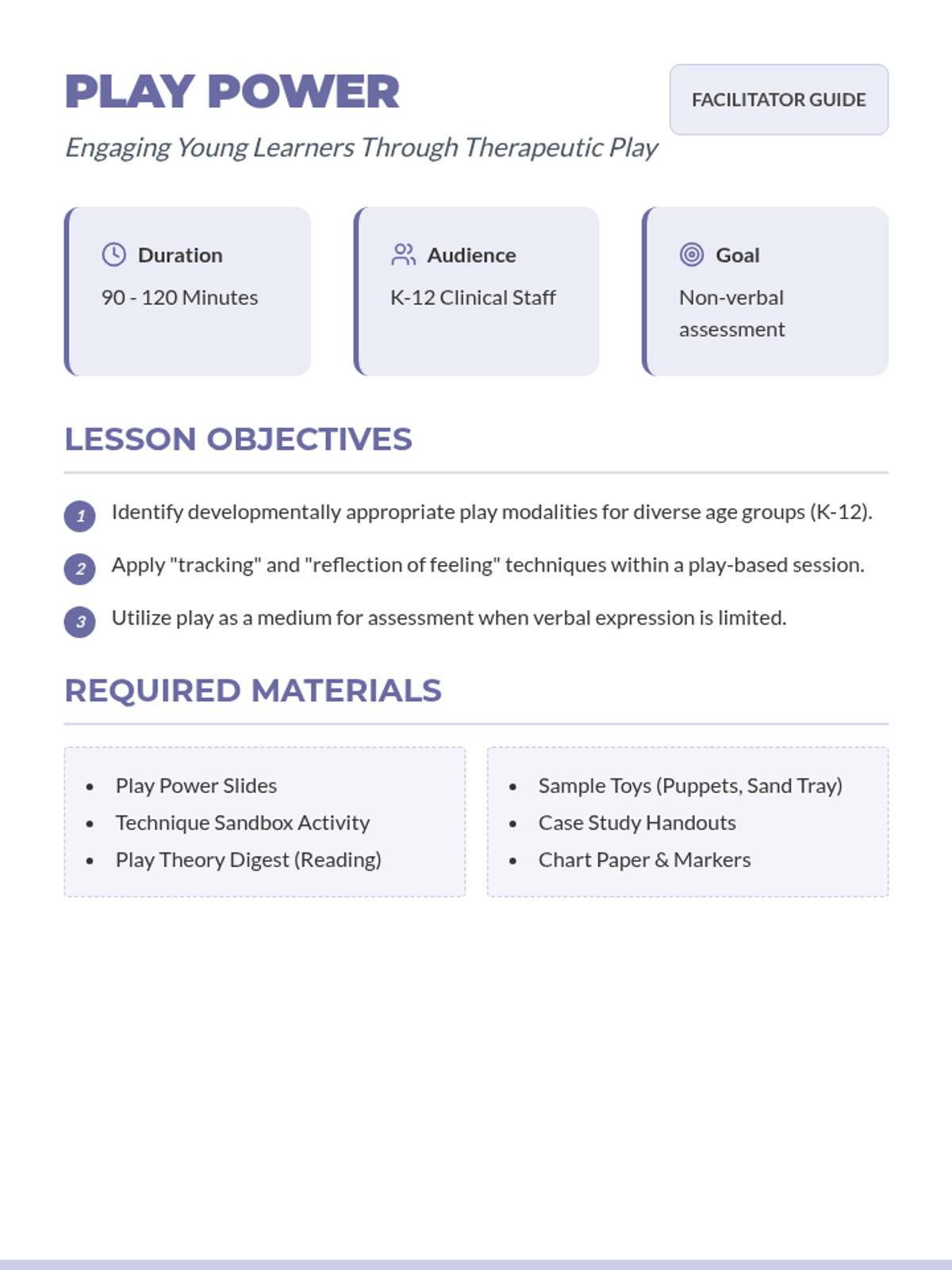 A comprehensive facilitator guide for training clinical staff on play therapy techniques, including pacing, scripts, and learning objectives.