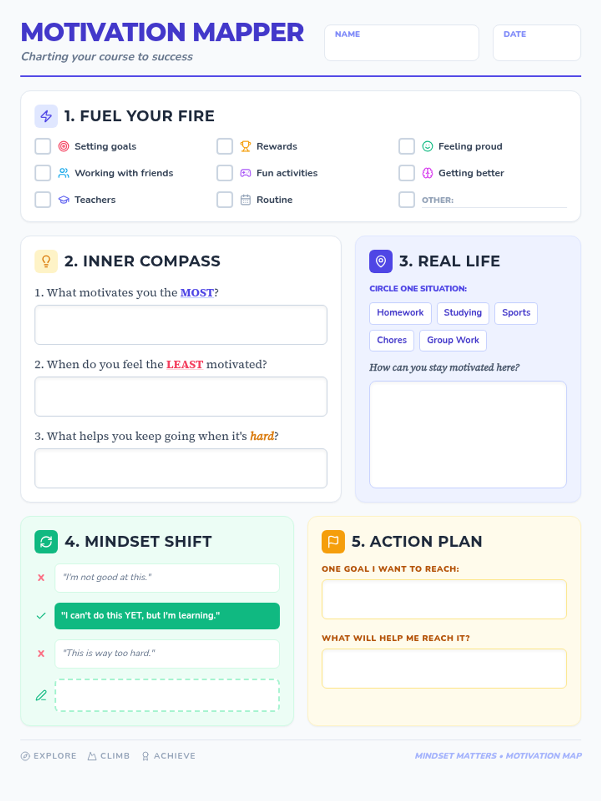 A single-page motivation mapping worksheet for students to identify personal drivers and develop a growth mindset. Featuring white work areas for high contrast and a compact, organized layout.