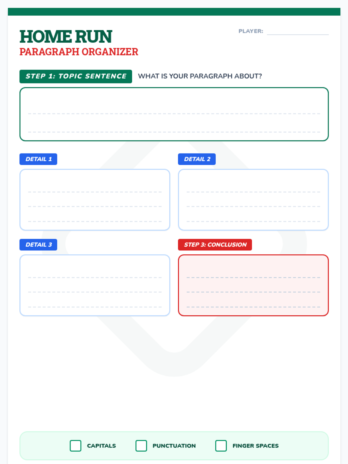 A structured writing graphic organizer that uses a baseball diamond metaphor to help students organize a paragraph with a topic sentence, three details, and a conclusion. Features a grid layout for single-page printing and dashed handwriting lines.