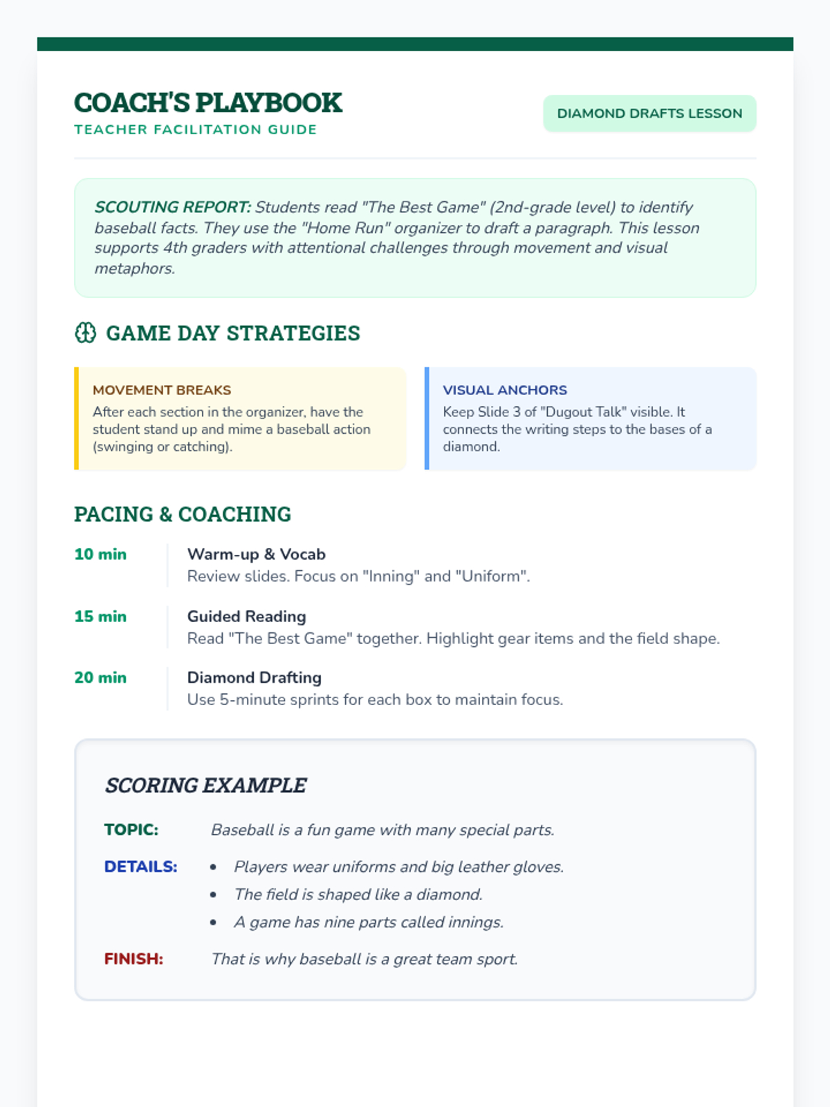 Teacher-facing facilitation guide for the Diamond Drafts lesson. Includes ADHD-specific strategies, a suggested pacing guide, and an exemplar answer key for the paragraph organizer. Revised for improved layout and additional instructional detail.
