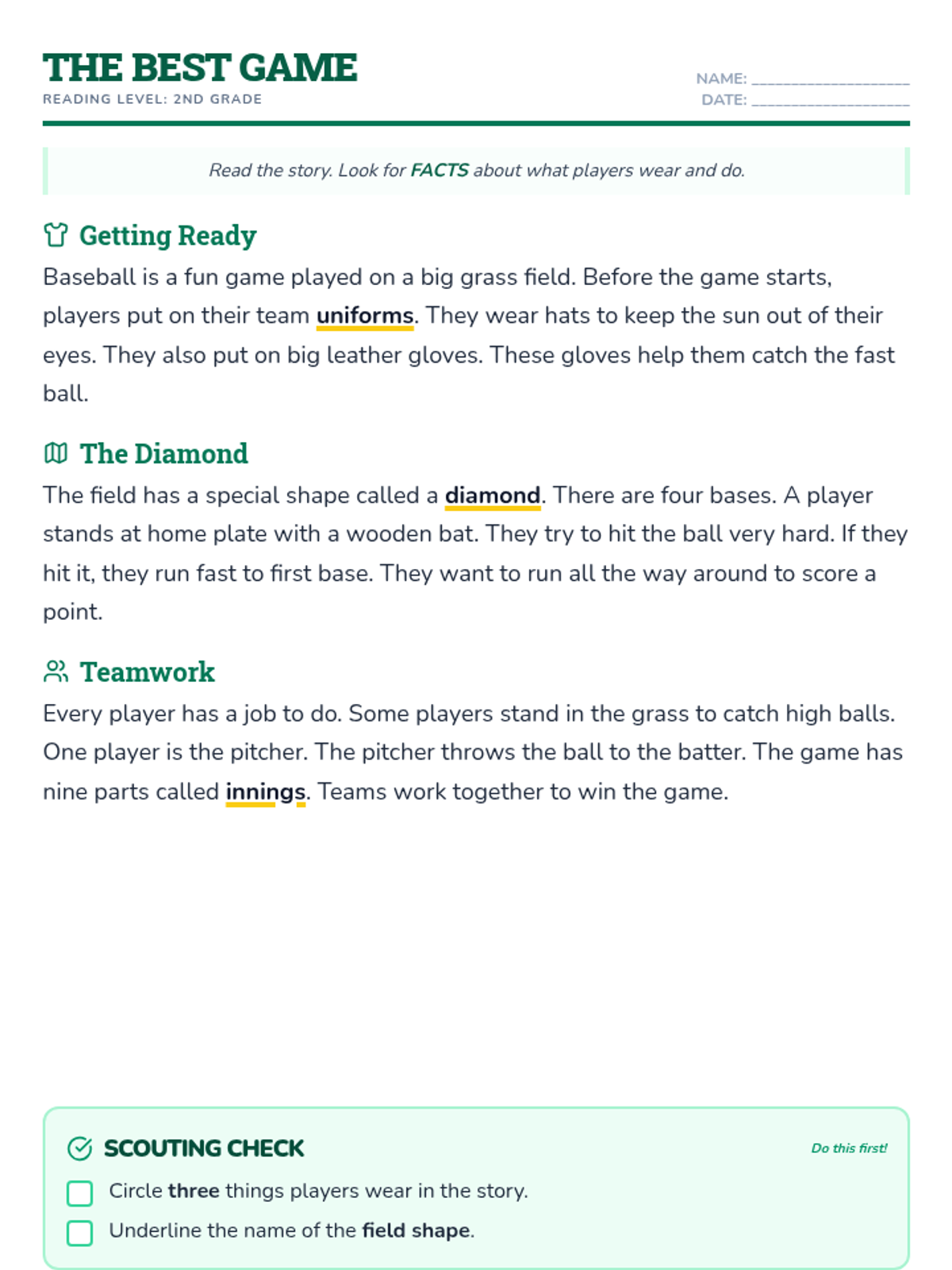 A high-interest reading passage about baseball, leveled for a 2nd-grade reader. Features large font, clear headings, and visual cues to support focus. Spacing adjusted for single-page printing.