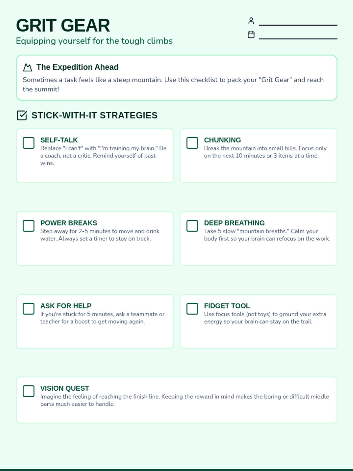 A reflective worksheet for students to identify and plan 'stick-with-it' strategies like self-talk, chunking, and power breaks for challenging tasks.
