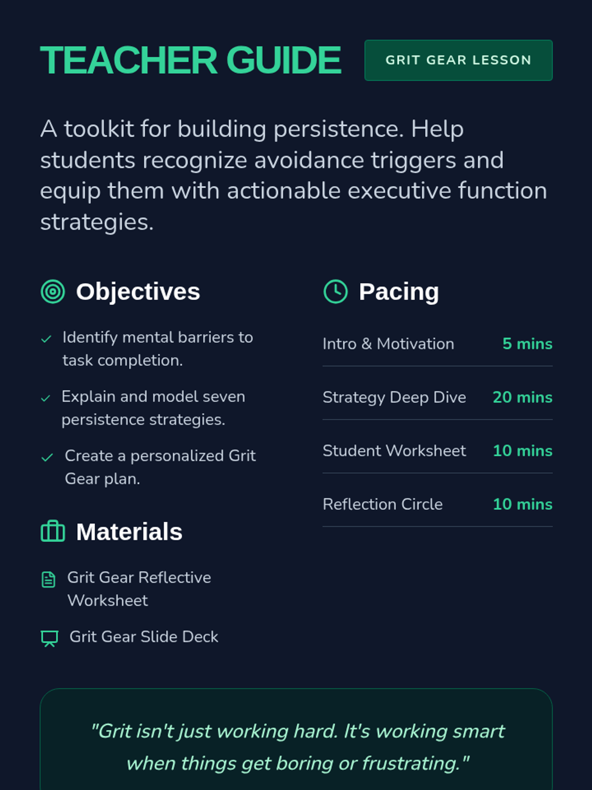 A comprehensive teacher guide for the Grit Gear lesson, including learning objectives, pacing, instructional notes on resilience strategies, and differentiation tips.