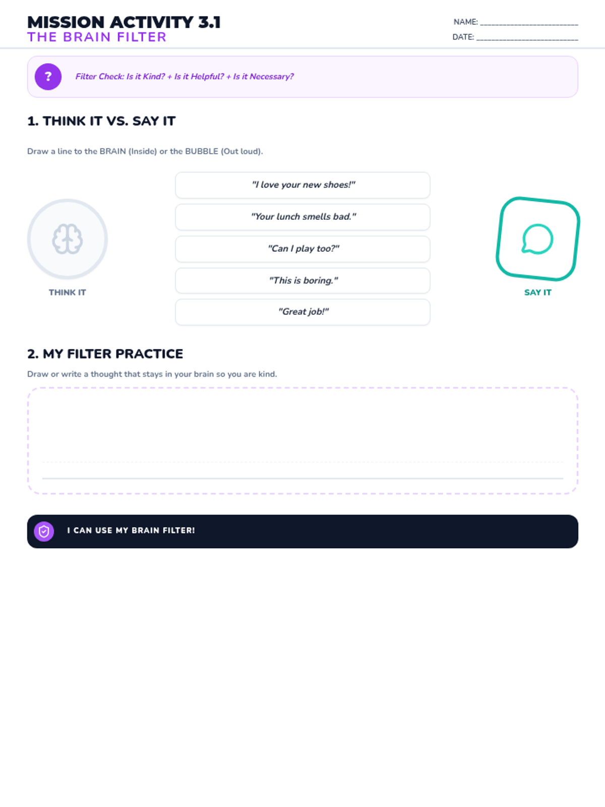 A student worksheet for the 3rd week of the impulse control unit, focused on the 'Brain Filter' concept. Updated for layout and single-page fit. Added handwriting guides.