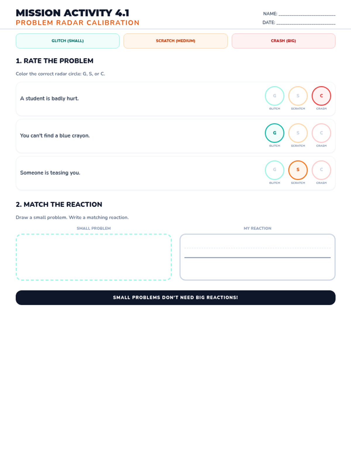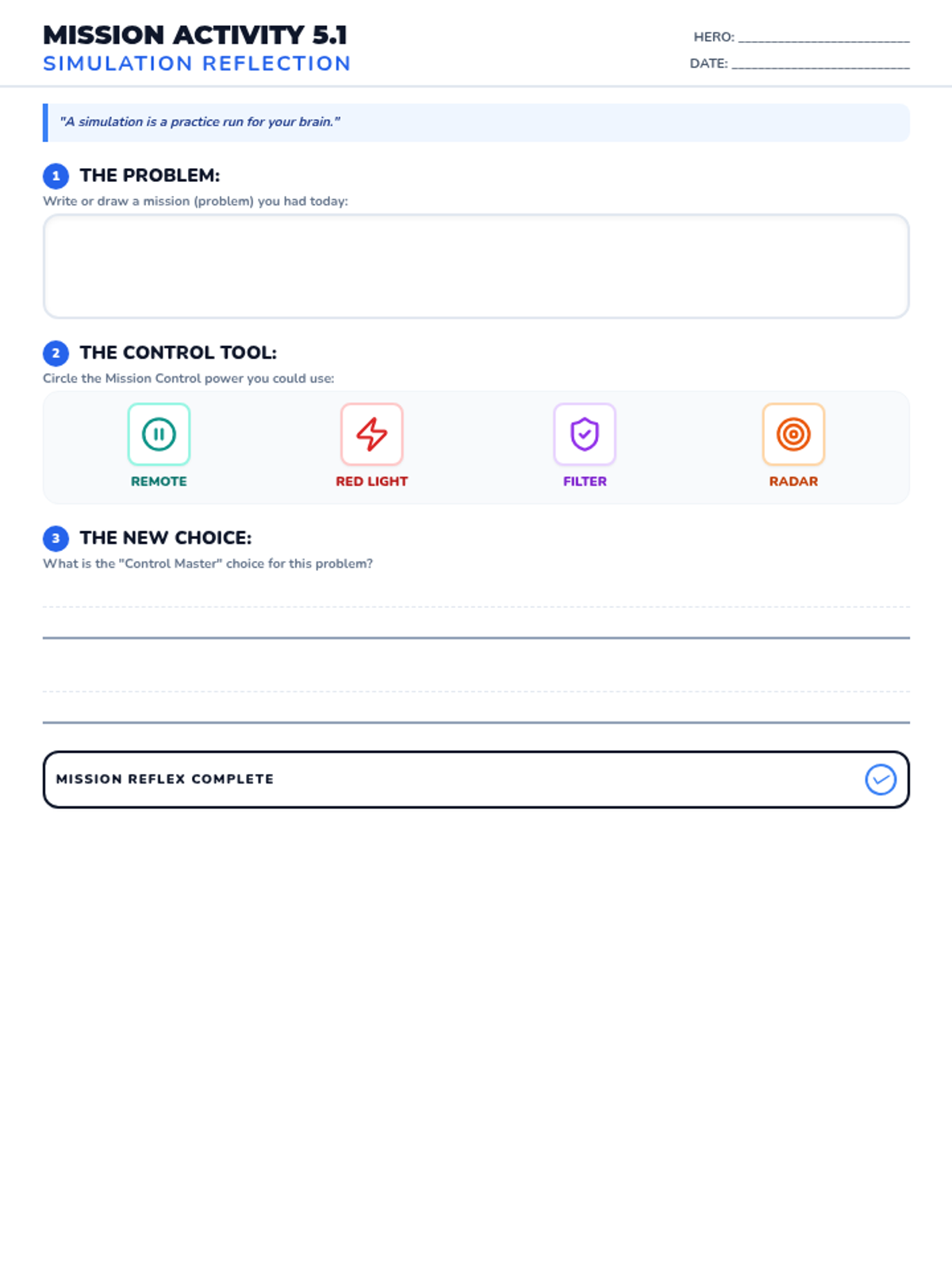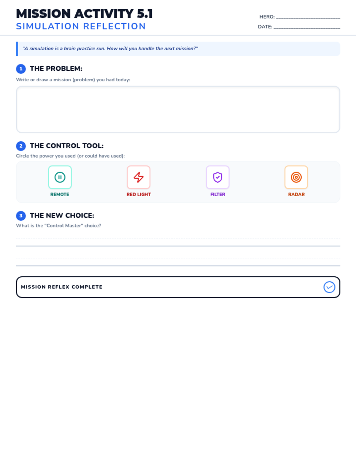 A student worksheet for the 5th week of the impulse control unit, allowing students to reflect on a personal scenario. Updated for single-page fit and improved icon sizing.