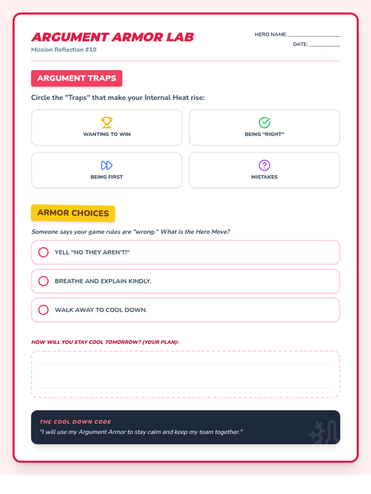 A student reflection worksheet for the Argument Armor lesson. It helps students identify personal argument triggers and select appropriate de-escalation strategies.
