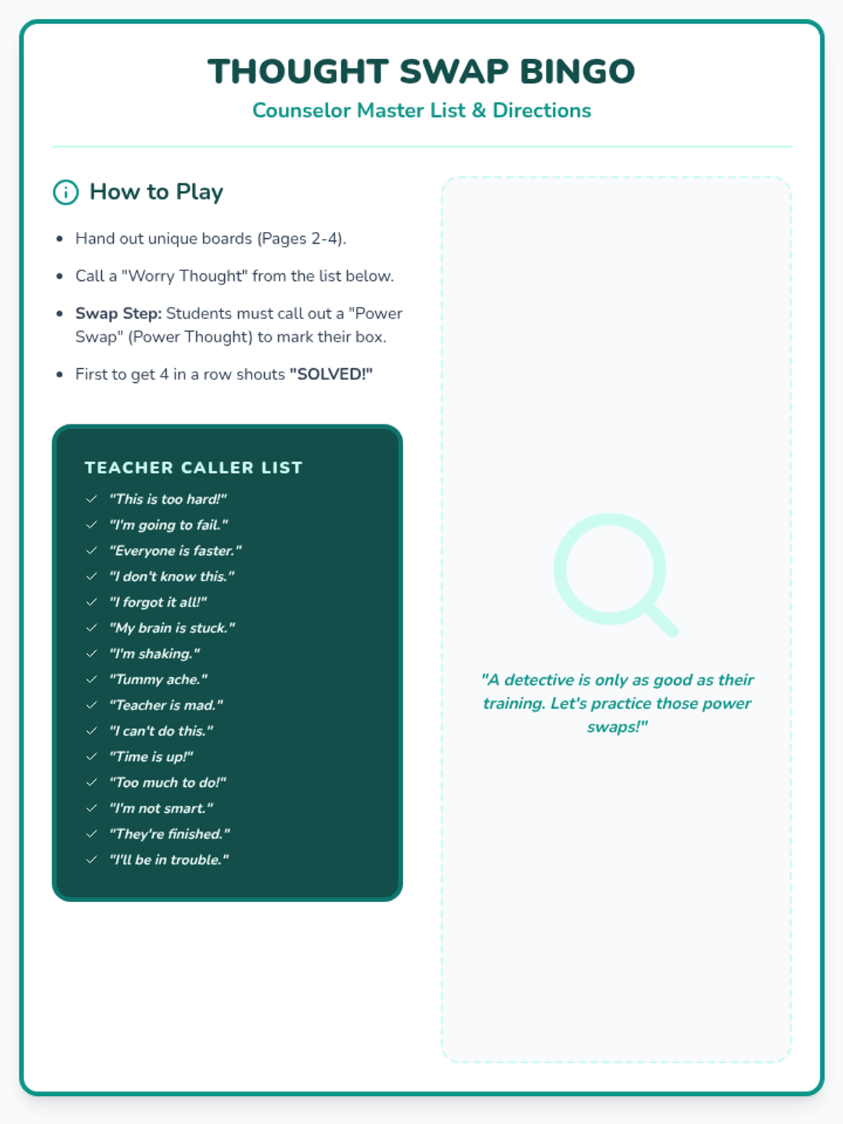 Final polished Thought Swap Bingo Game. Corrected caller list to match all board items, increased teacher caller font size, added randomized board variations, and improved student board readability with marking circles.