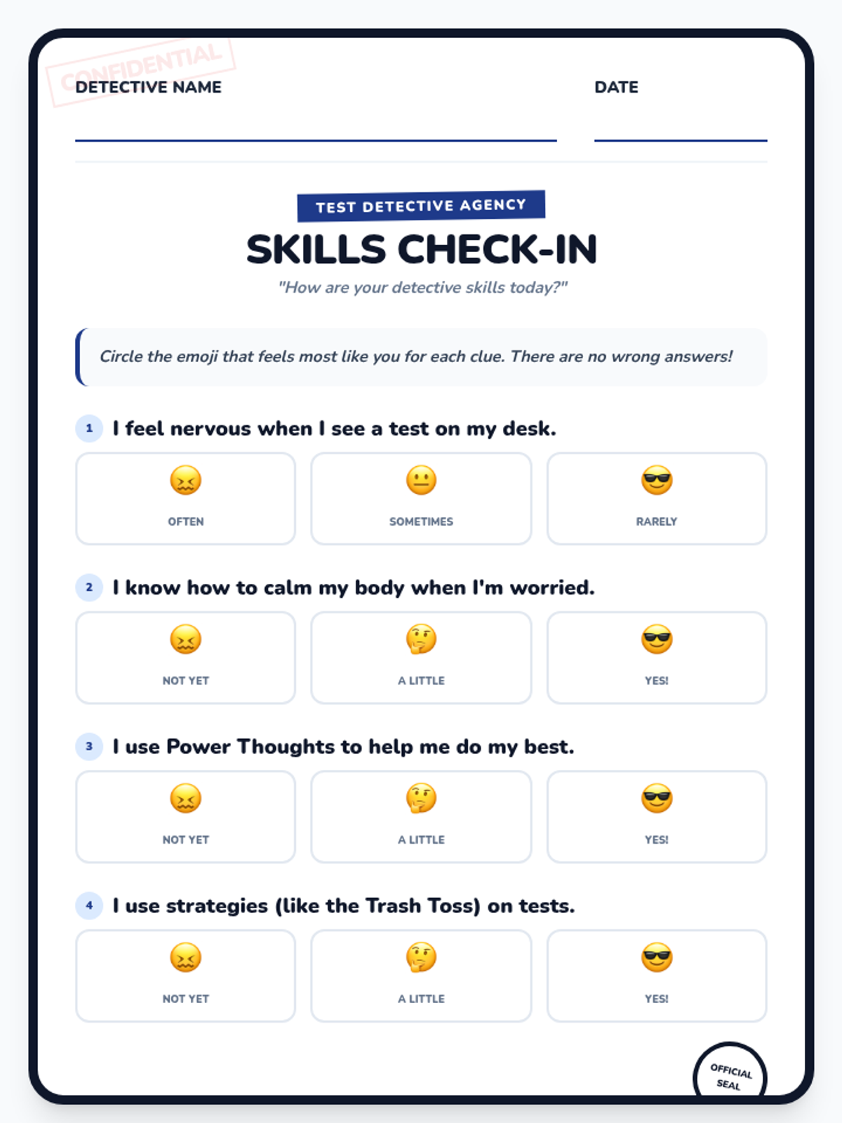 A student self-evaluation form for the beginning and end of the Test Detective Agency group. Students use an emoji scale to rate their test anxiety levels and confidence with coping strategies. Revised to fix page breaks and icon consistency.