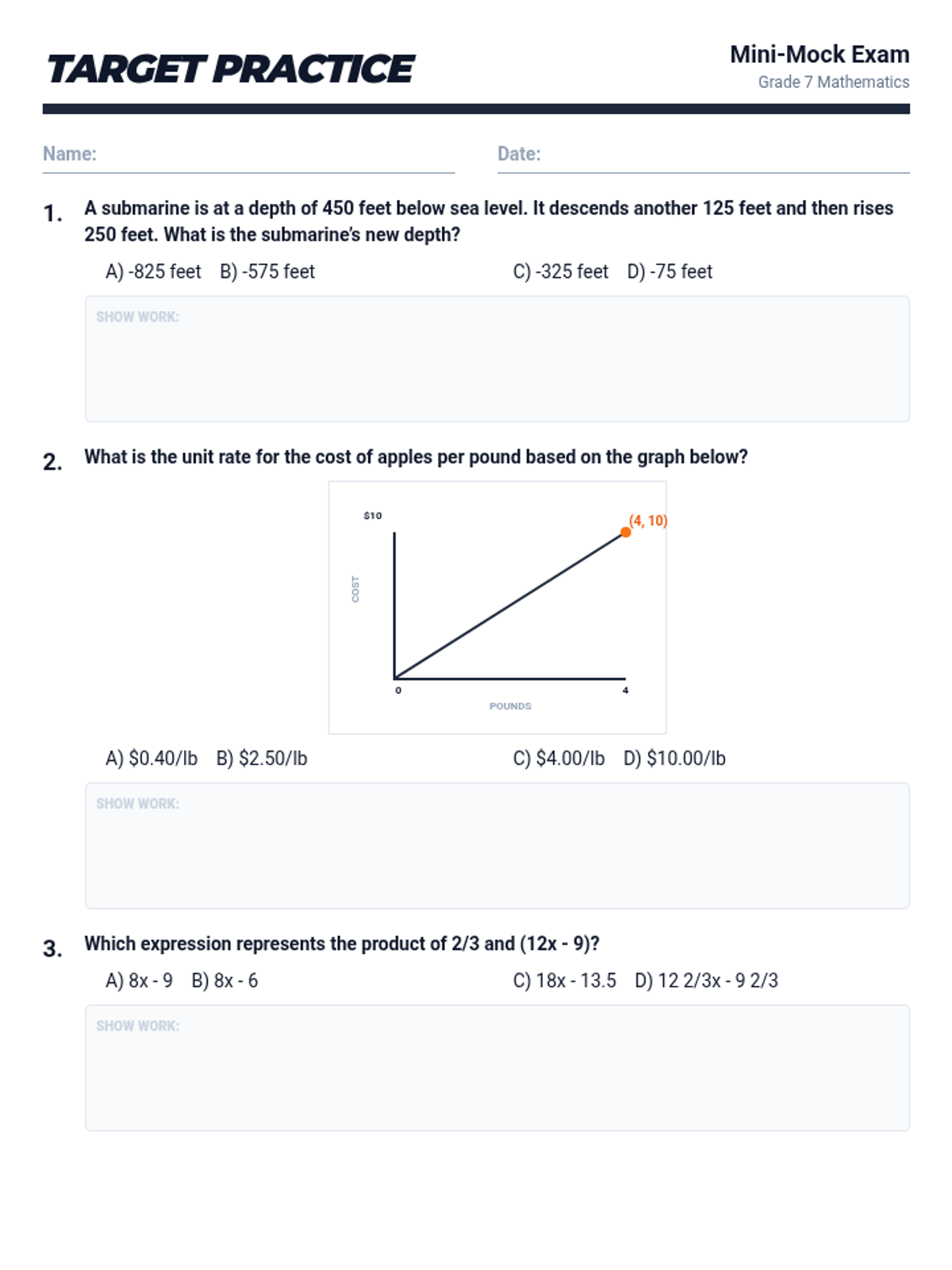 A 5-question mini-mock exam in the style of the NYS Grade 7 Math test. Revised with axis labels on graphs, better page flow, and a properly fitting reflection area.