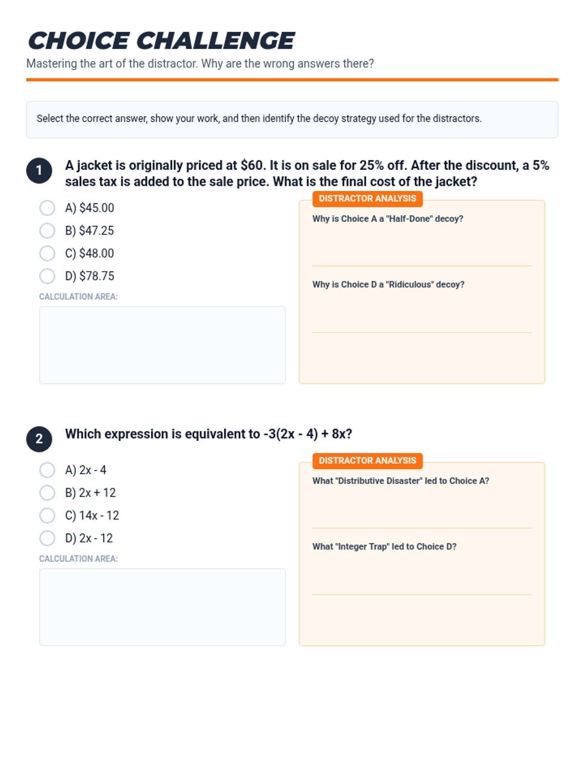 A practice worksheet where students solve multiple-choice questions and perform 'distractor analysis'. Revised for better page flow and larger writing areas.