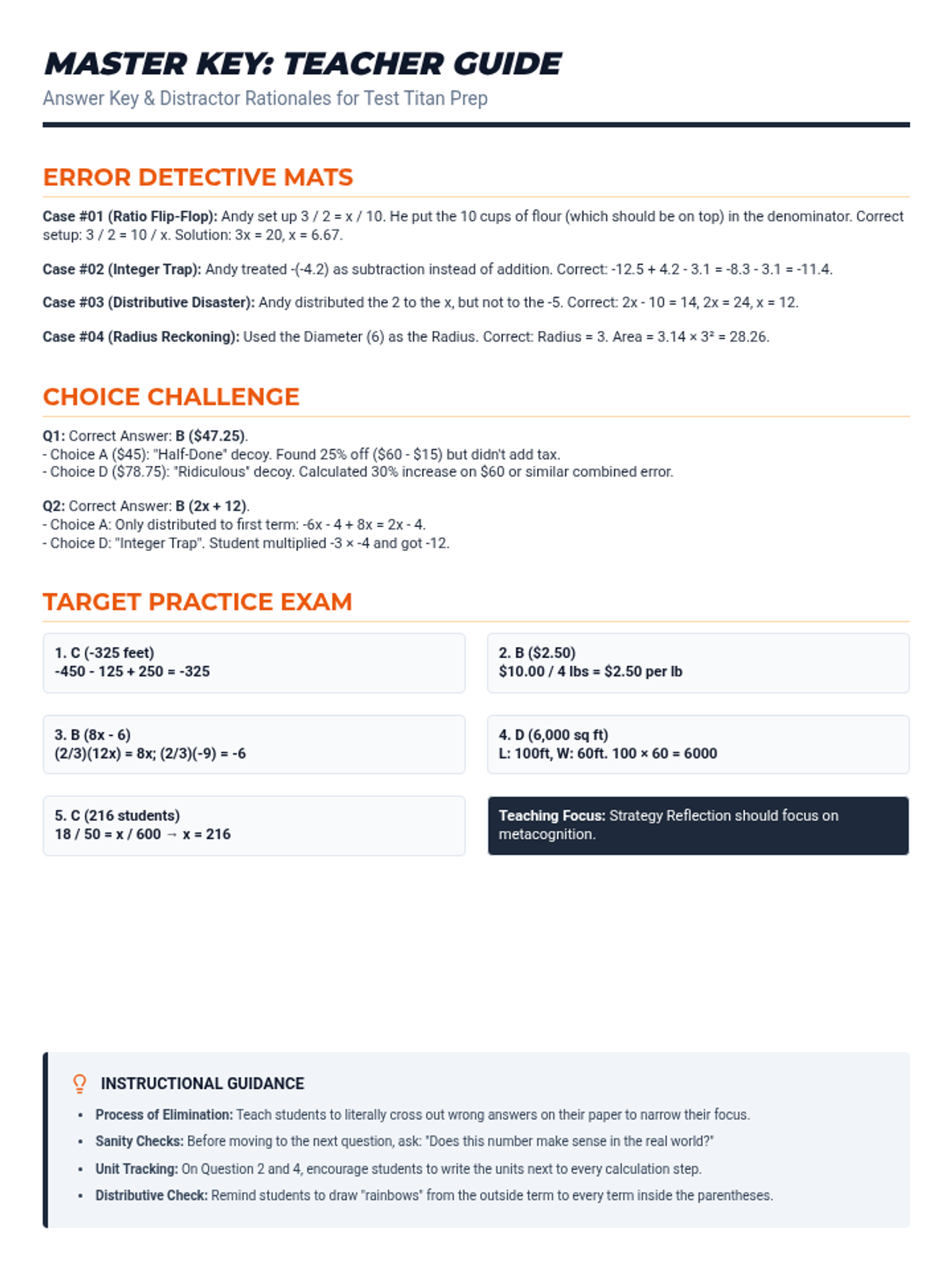An answer key and teacher's guide for the Test Titan packet. Revised with darker math rationales, corrected page flow, and consolidated teaching tips.