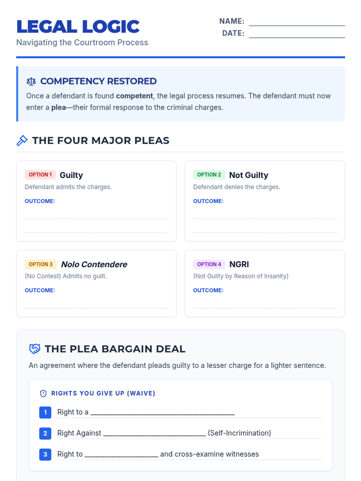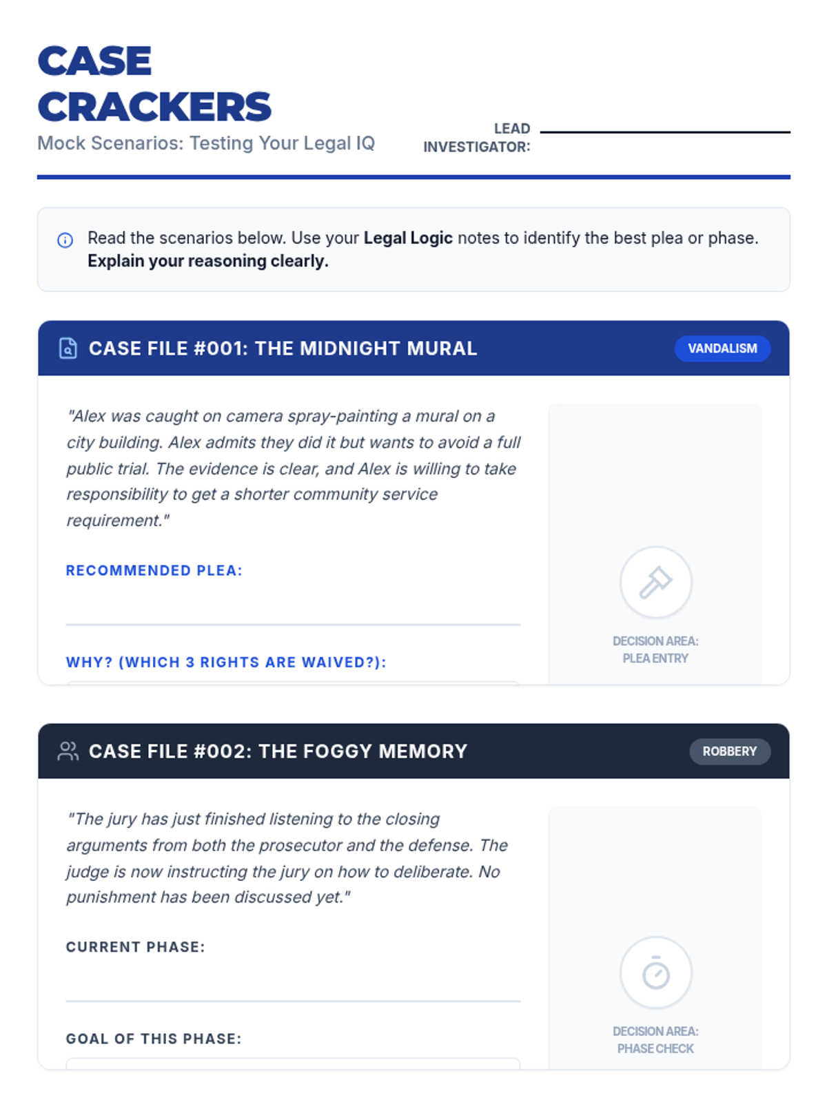 An interactive activity sheet featuring three mock legal scenarios where students must apply their knowledge of pleas, rights, and trial phases to determine the correct legal course of action.