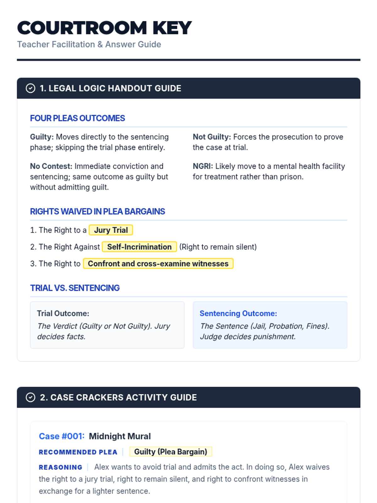 A comprehensive teacher guide providing answer keys for the Legal Logic handout and Case Crackers activity, along with instructional tips for facilitating a lesson on the post-competency legal process.