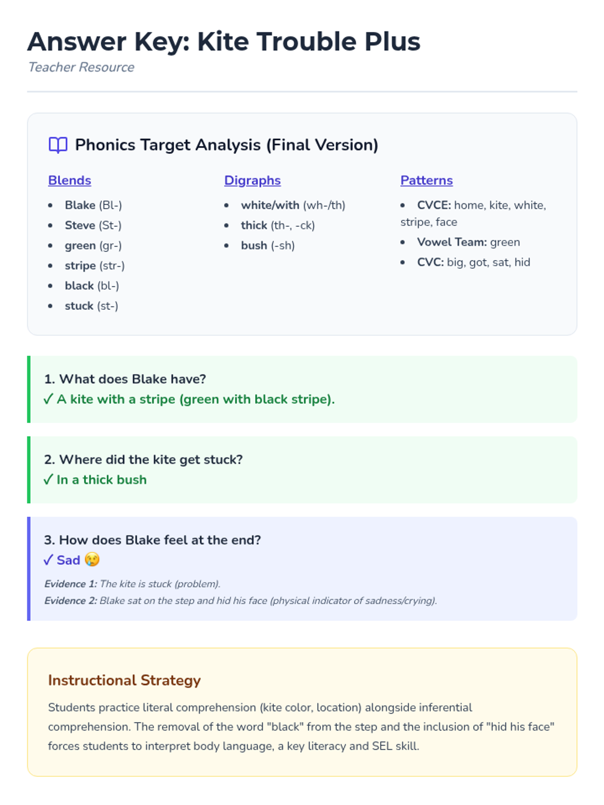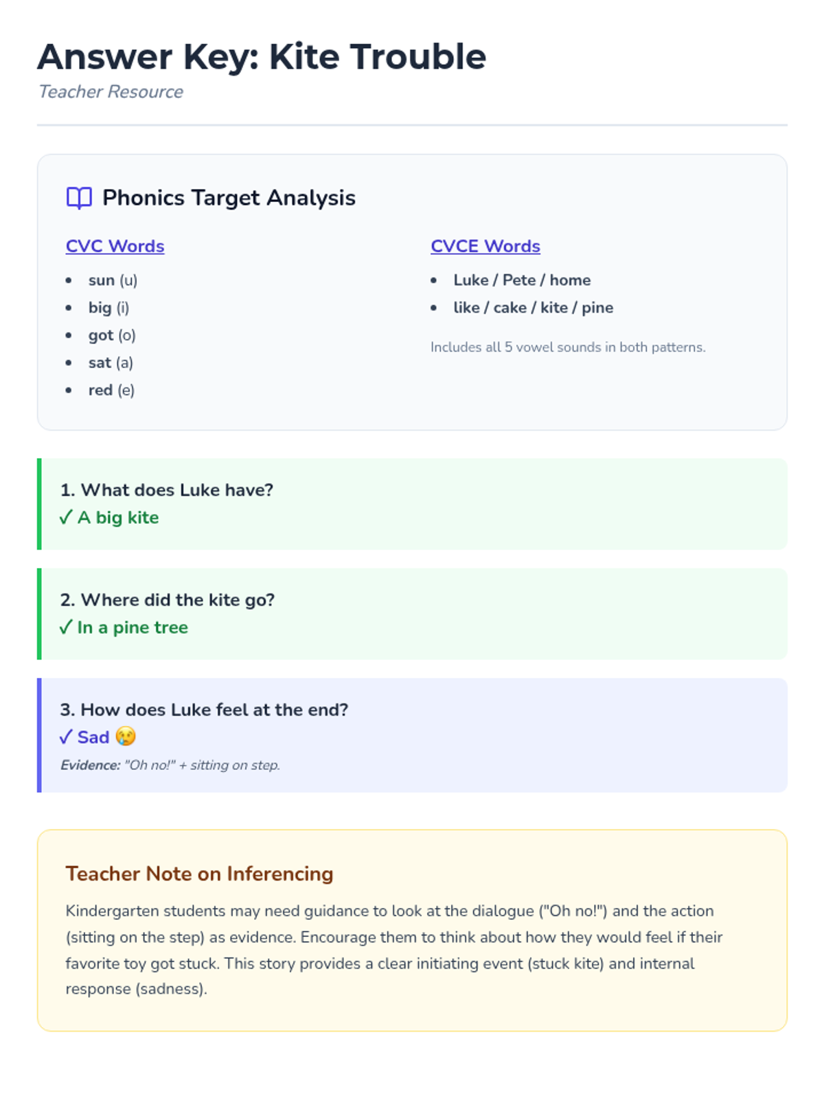 An answer key for the Kite Trouble worksheet, including a breakdown of the CVC and CVCE words used in the text and teacher notes on guiding students through the inferencing process.