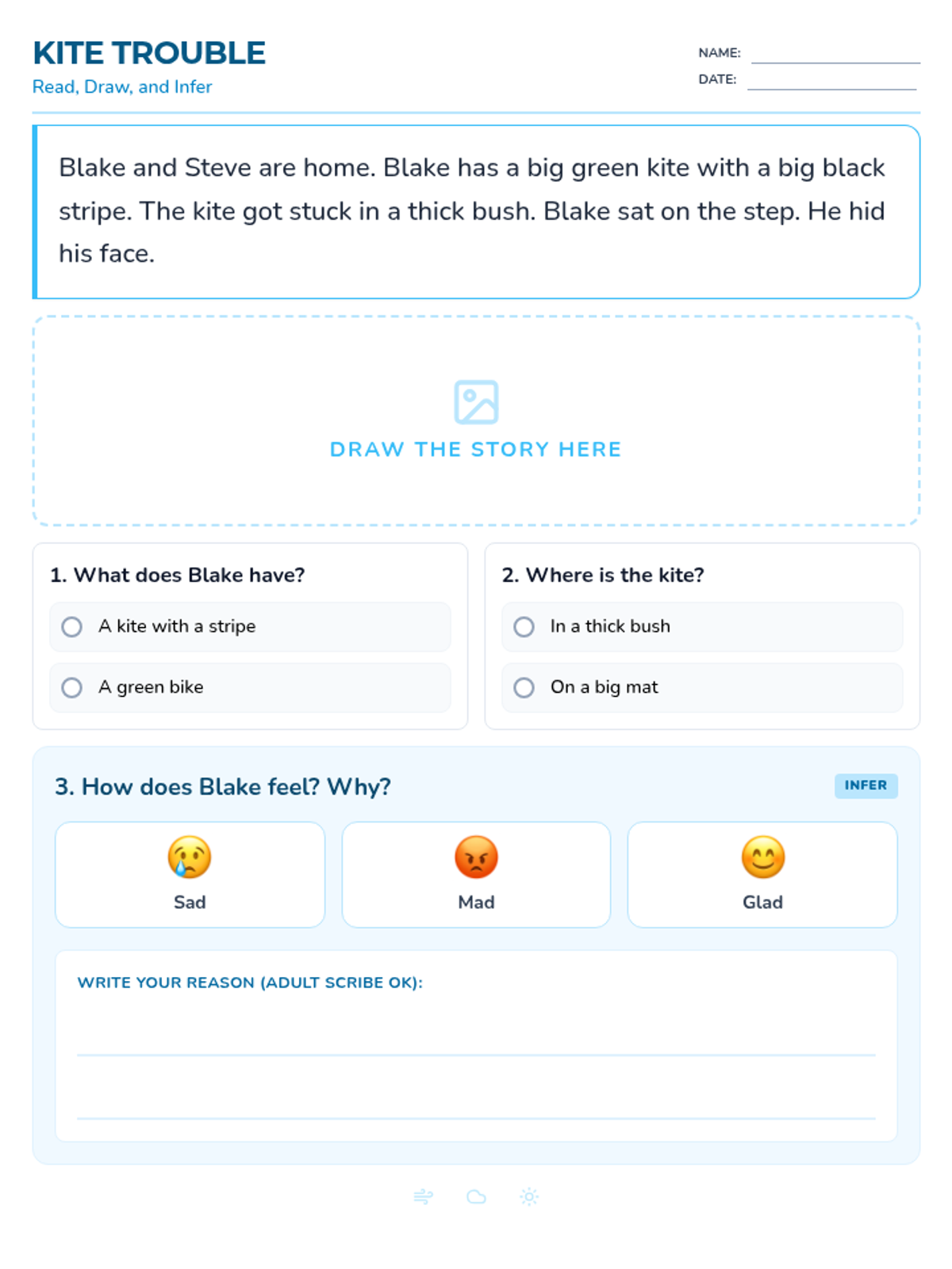 A student worksheet featuring a decodable paragraph focused on a kite story with blends and digraphs. It excludes explicit feeling words to encourage character inference and includes an illustration space and comprehension questions.