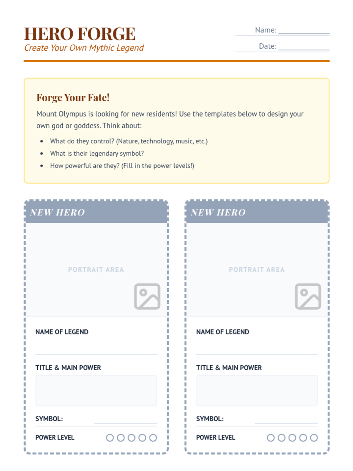 A creative writing activity where students design their own Greek god or goddess using a blank trading card template. High-contrast labels and spacious work areas for younger writers.