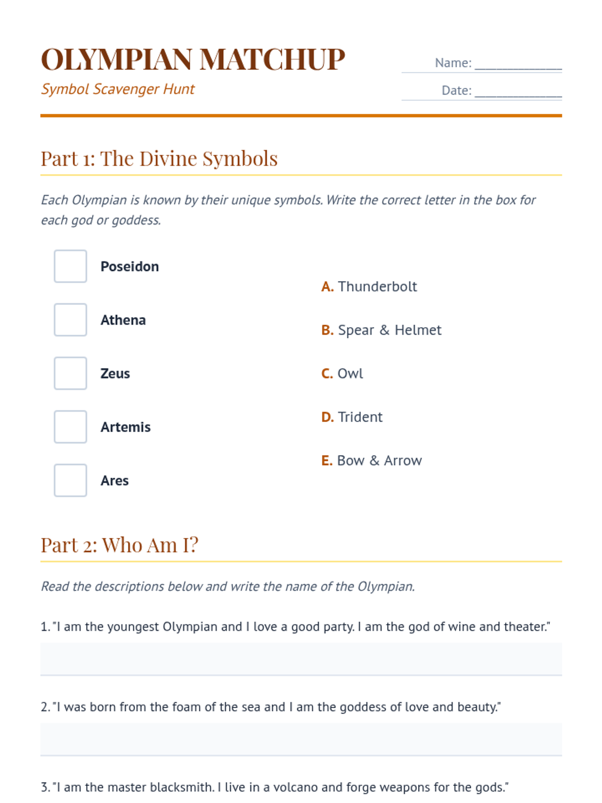 A comprehension worksheet where students match Greek gods and goddesses to their symbols and identify them based on short character descriptions.