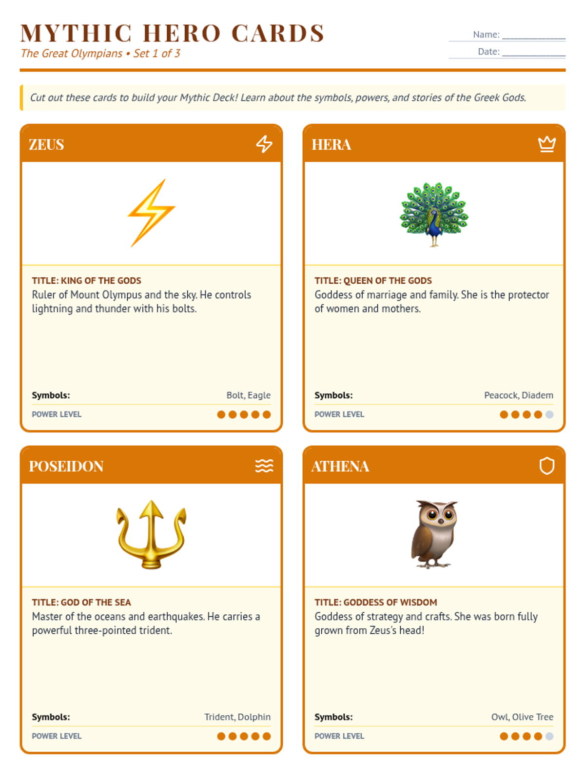 A collection of 12 beautifully designed trading cards featuring major Greek gods and goddesses, including their symbols, titles, and key mythological facts. Each page features 4 cards, ensuring they are cut-ready.