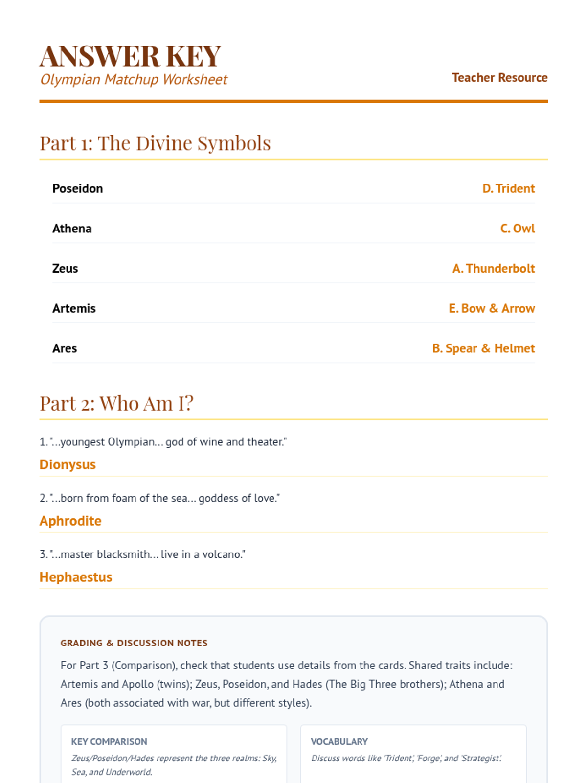 An answer key for the Olympian Matchup Worksheet, providing correct pairings for symbols and character descriptions. Condensed to a single page with teaching notes.