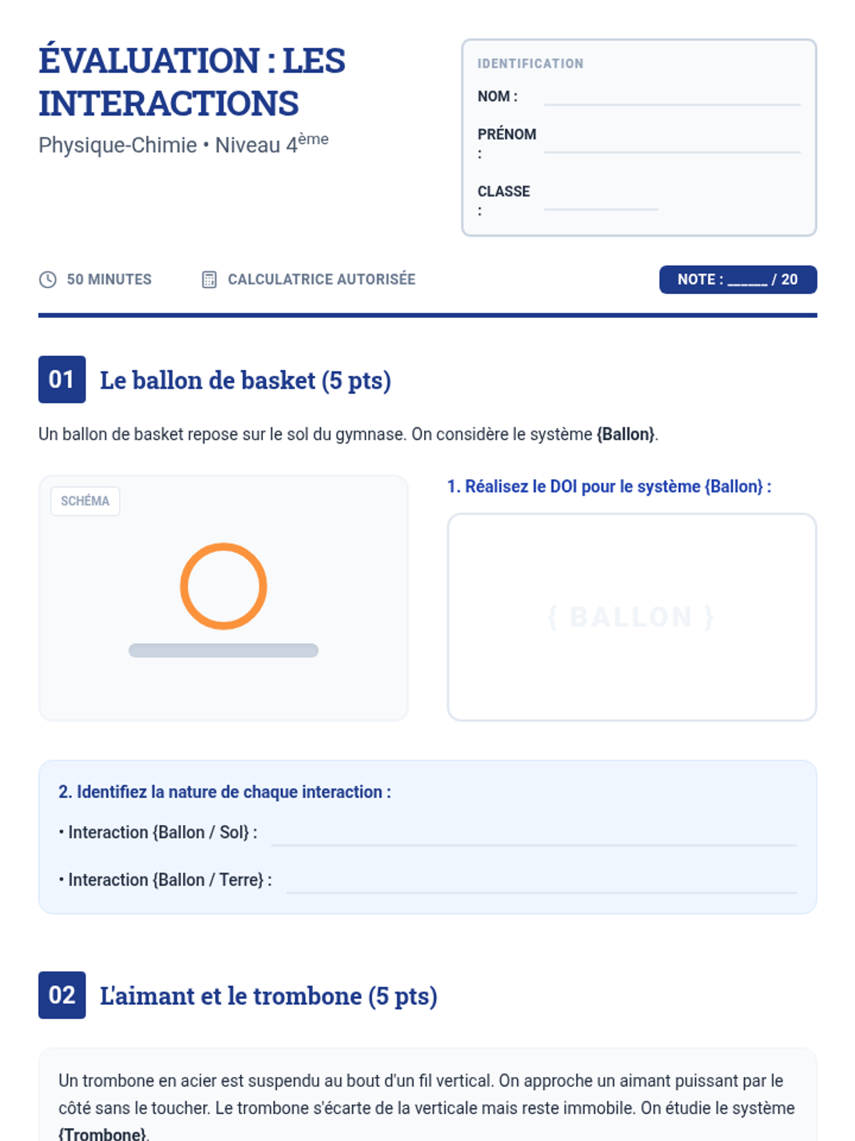 Une évaluation de physique-chimie de 50 minutes pour le niveau 4ème, centrée sur les interactions et les forces. Elle demande aux élèves de construire des DOI et de représenter des vecteurs forces avec précision.
